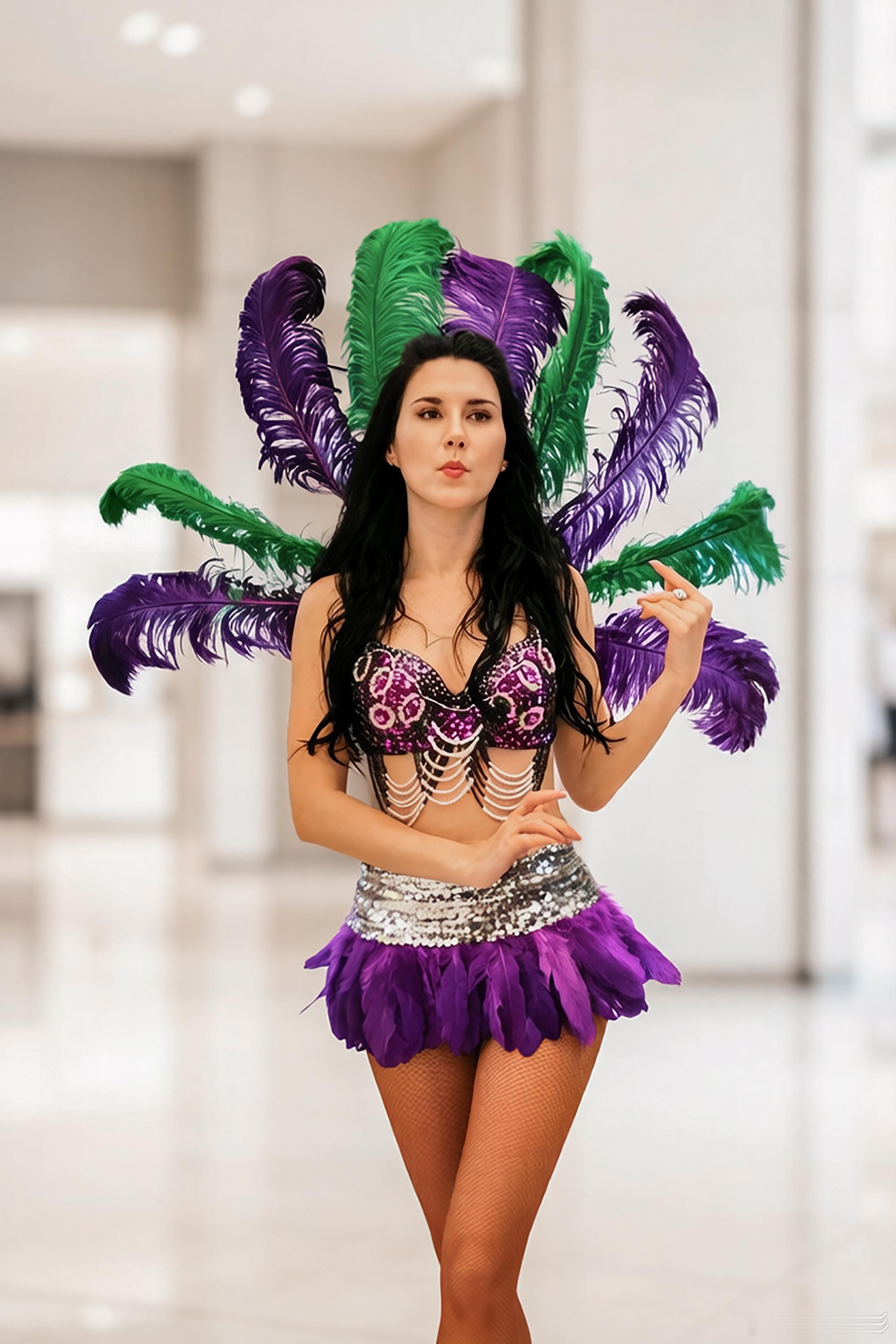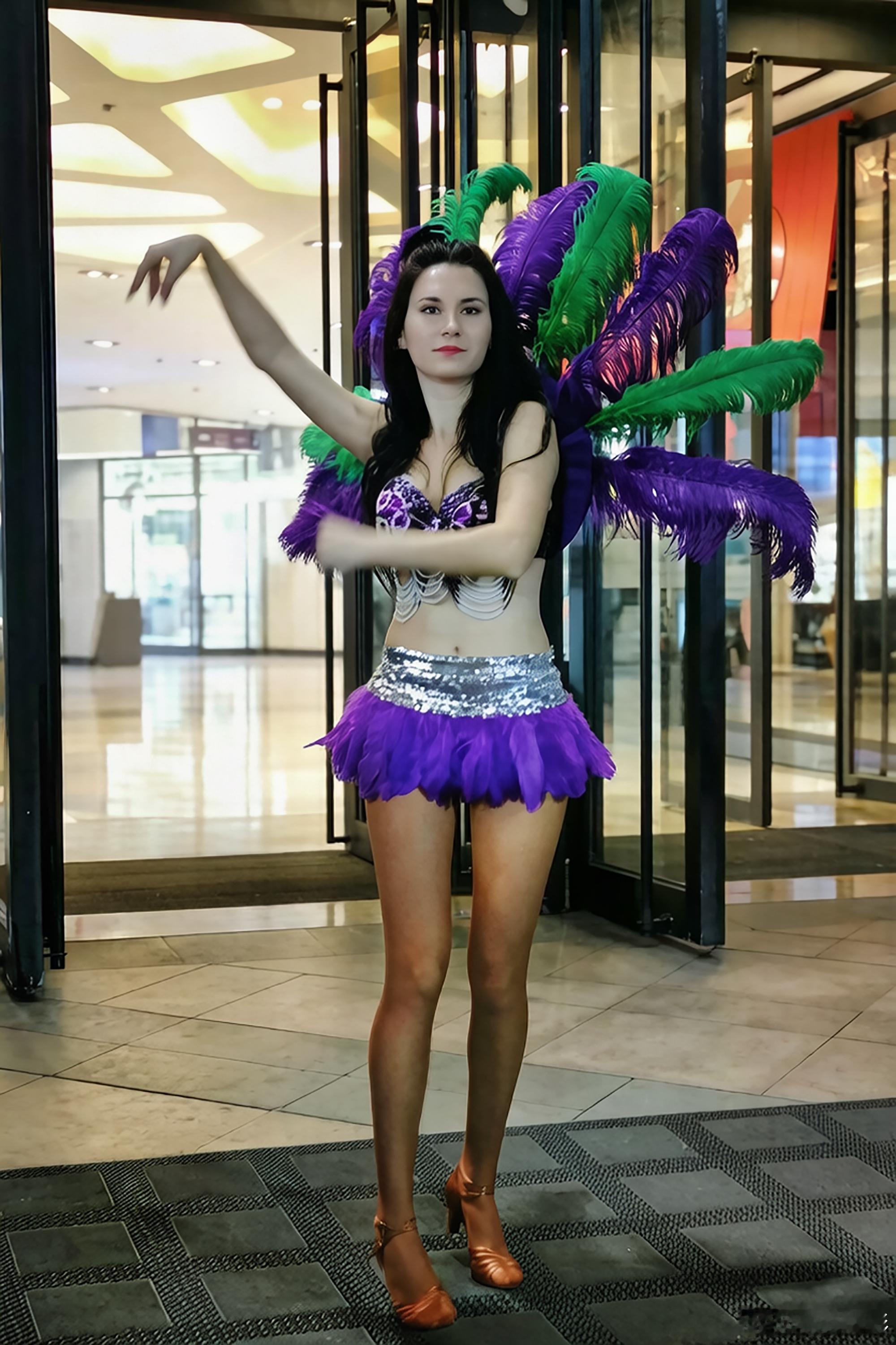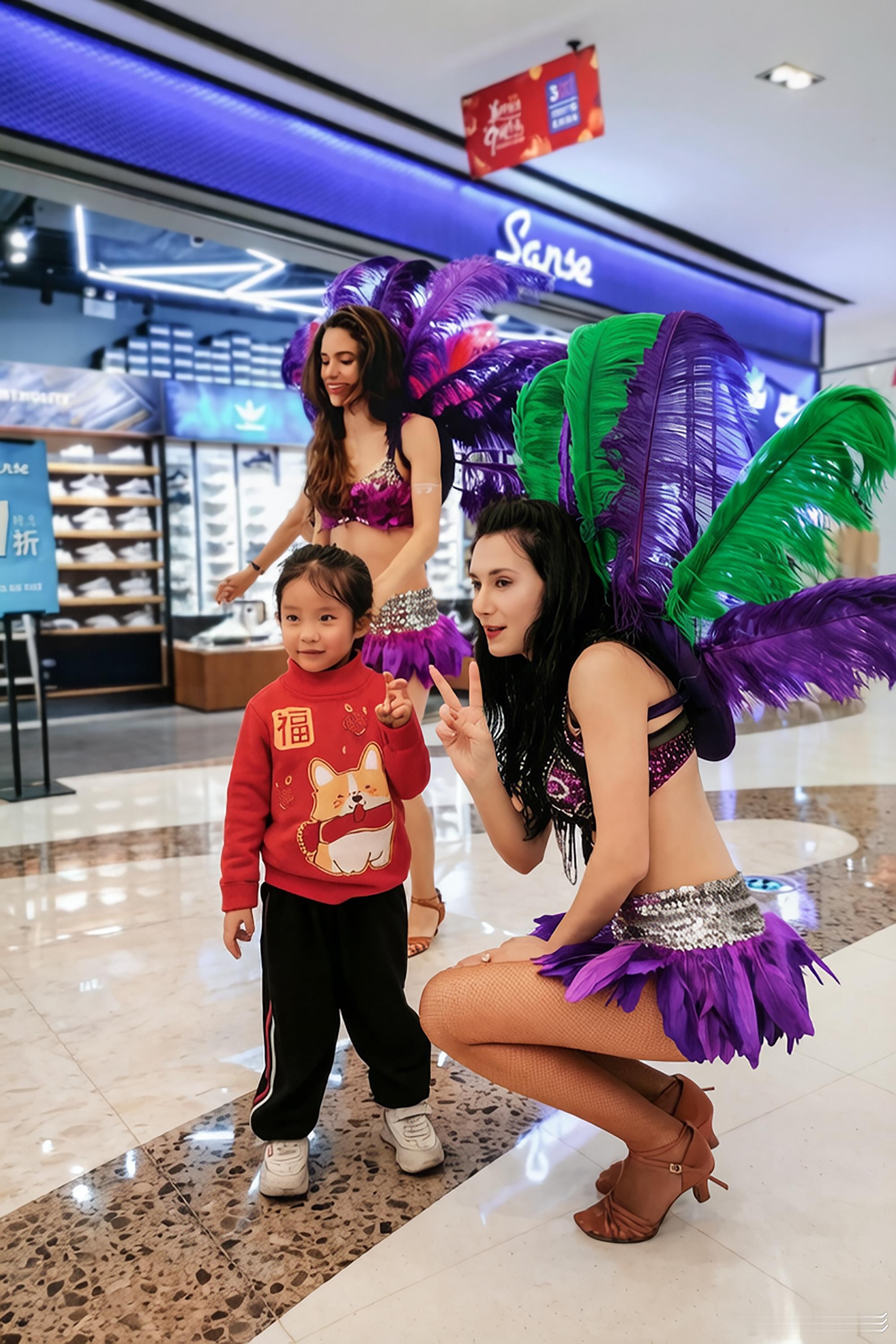 桑巴舞女郎又来了!舞者与萌娃同框互动,笑容如花绽放,欢乐满溢商场。