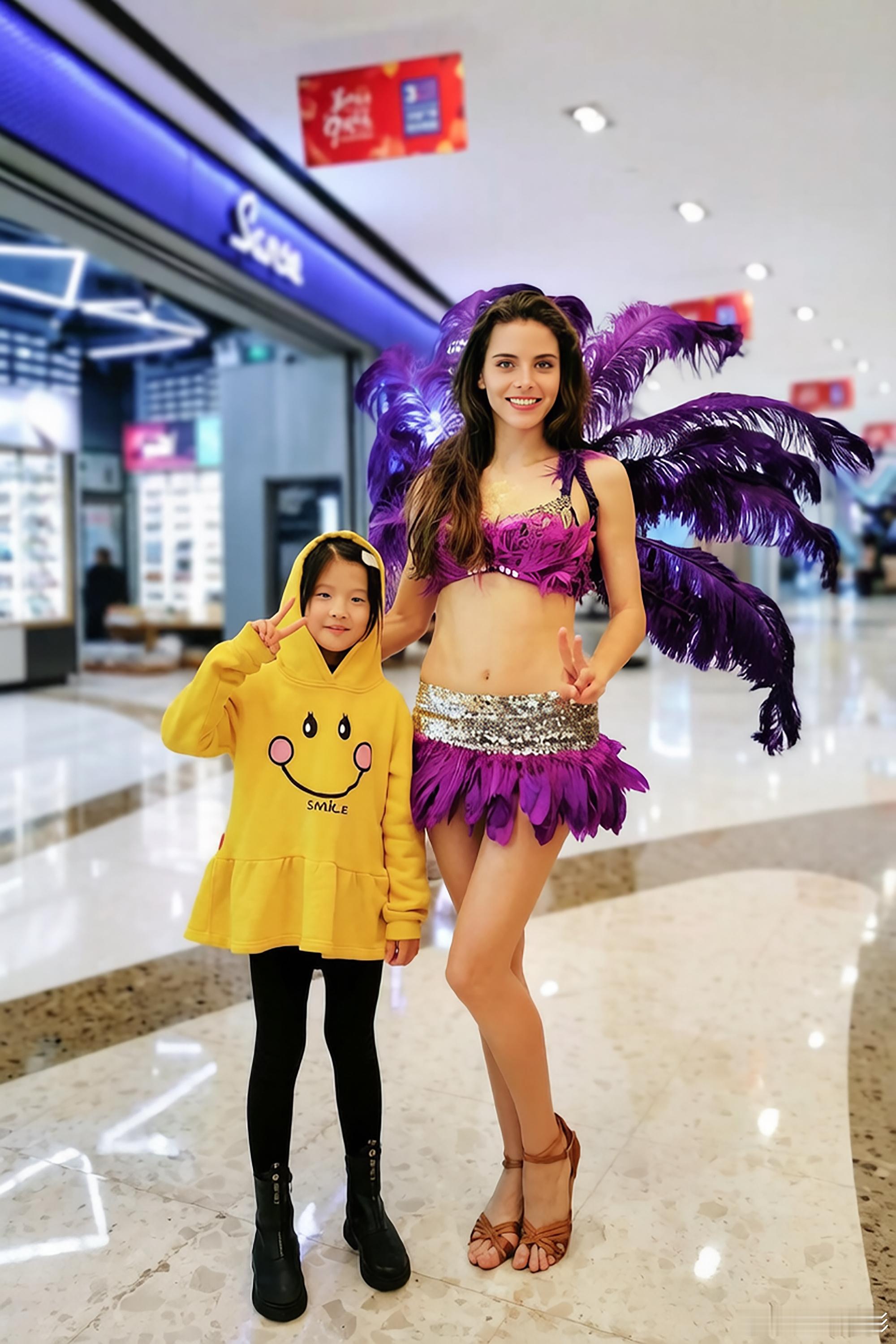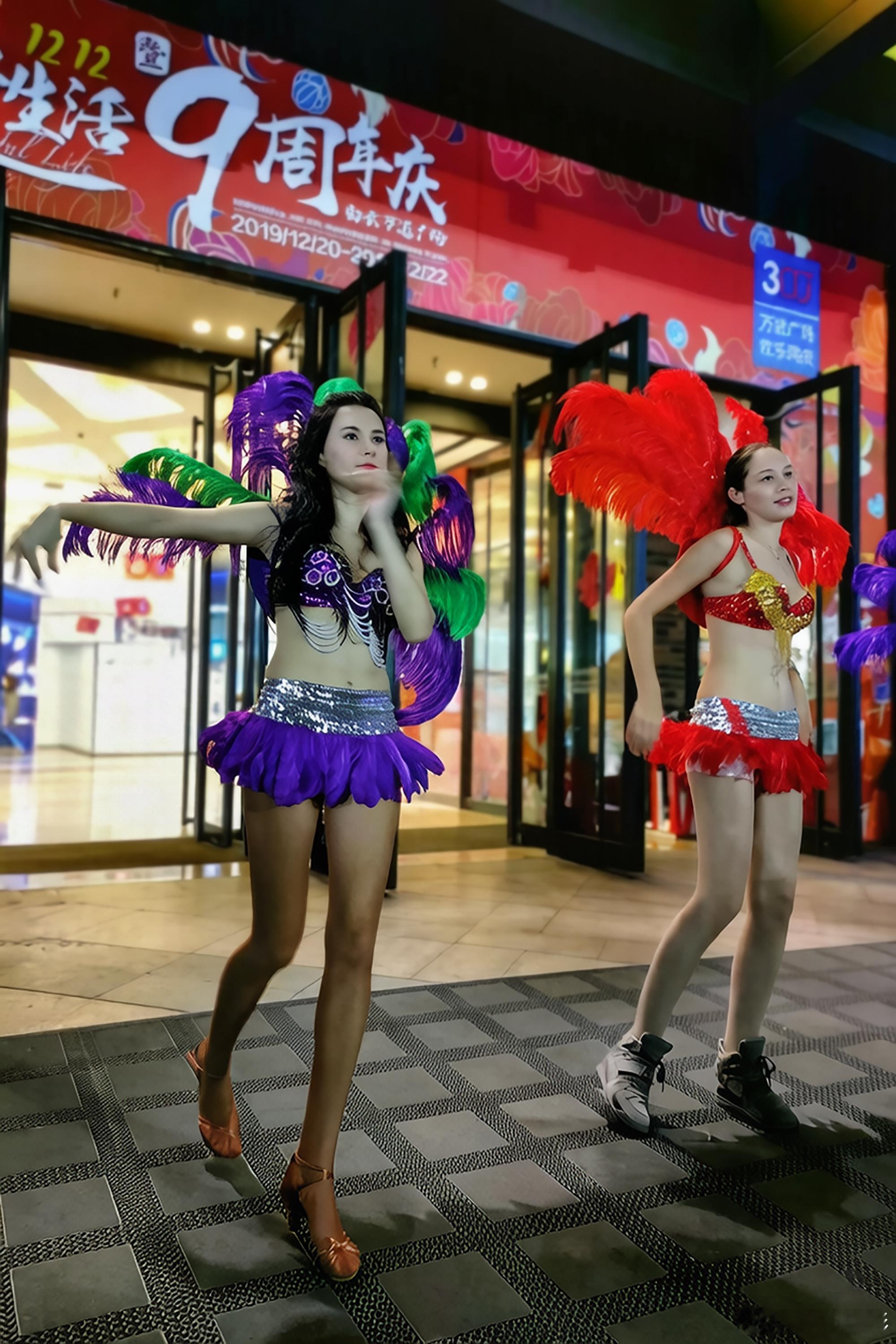 桑巴舞女郎又来了!舞者与萌娃同框互动,笑容如花绽放,欢乐满溢商场。📷 华为 p