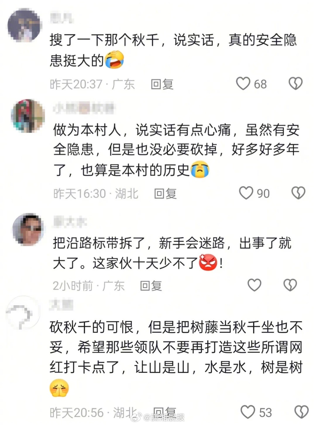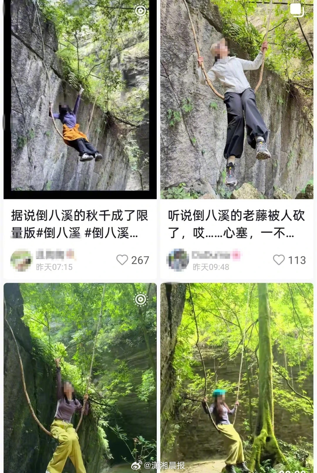 【#树藤因能荡秋千走红被蒙面人砍断#,徒步者设置的路标也被收走,#当地回应网红树藤被蒙面人砍断#:多部门介入,在找人】近日,多位网友发视频,称湖北宜昌一网红树藤被多名蒙面人砍断,此外,徒步者设置的沿途路标也被收走。据悉,该藤蔓因可以“荡秋千”,吸引不少人前往拍照打卡。藤蔓被砍一事引发热议,有网友认为,“砍了也好,真出事怕兜不住”,也有网友觉得不妥:“有安全隐患也不至于砍掉,好多年了也算村子历史。·晨视频记者注意到,有到过此地的网友称秋千下方是平地,且多数人不会在现场长时间停留,他认为或许有一定安全隐患,但不至于以破坏自然的方式进行消除。4月9日,记者从藤蔓所在地附近高岩村一村民处了解到,被砍树藤是当地一处网红打卡点,平时有不少人来,藤蔓下方不是悬崖,“他打着安全的旗号,把藤蔓割断,还把导航飘带撤掉,以后来的人可能因此会迷路。”至于藤蔓是否为珍稀植被,他表示不知情。该村民认为沿路可能会有一定安全隐患,但涉及户外都会就像很多事都会有风险一样,“通往该藤蔓的附近道路为一条古道,村民也会走,树藤本身没伤害任何人,既然他想做认为正义的事,就不要偷偷摸摸蒙面。”4月9日,记者致电宜昌点军区文旅局,工作人员表示确有此事,当地包括派出所在内的有关部门已介入,并通过监控等方式查人,不过因其蒙面目前还在寻找中,“地段涉及两个区,两边都在查,如果后续涉及毁坏名贵植被等情况,会依法查处。”对于有人认为前往野道徒步行为存在不妥一事,该工作人员回复,树藤所在区域属未开发区域,“涉及安全问题,在调查后会有结果。”同日,记者尝试致电土城乡政府未果。潇湘晨报·晨视频记者 史继超 武华康 宜昌