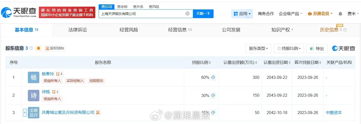【#郑合惠子近30日涨粉4.3万#,#揭秘郑合惠子新签约公司#】#郑合惠子签约杨幂新公司#4月9日,郑合惠子工作室官方微博认证信息正式变更为杨幂创办的上海天伊娱乐有限公司,相关话题引发关注。记者查询天眼查发现,上海天伊娱乐有限公司成立于2023年9月,法定代表人为杨春玲,注册资本500万人民币,经营范围包括组织文化艺术交流活动、剧本娱乐活动、咨询策划服务等,由杨春玲、诗摇、共青城尘星及月投资有限公司共同持股。第三方数据显示,郑合惠子平台现有粉丝261.8万,近30日涨粉4.3万。 上海