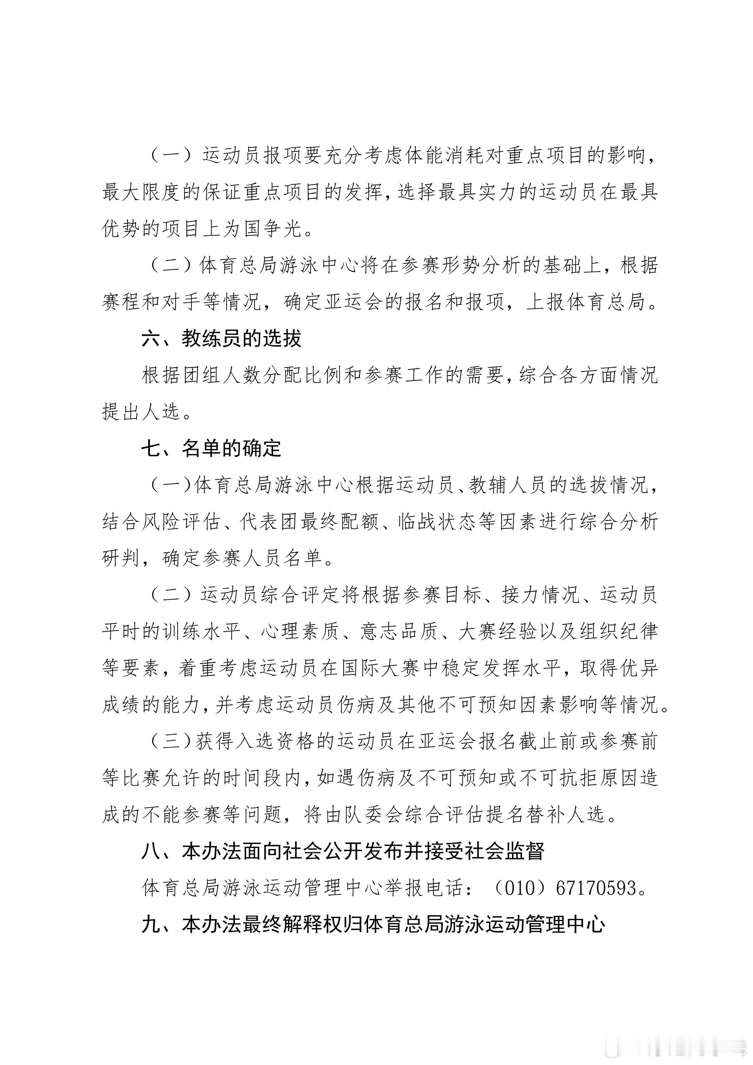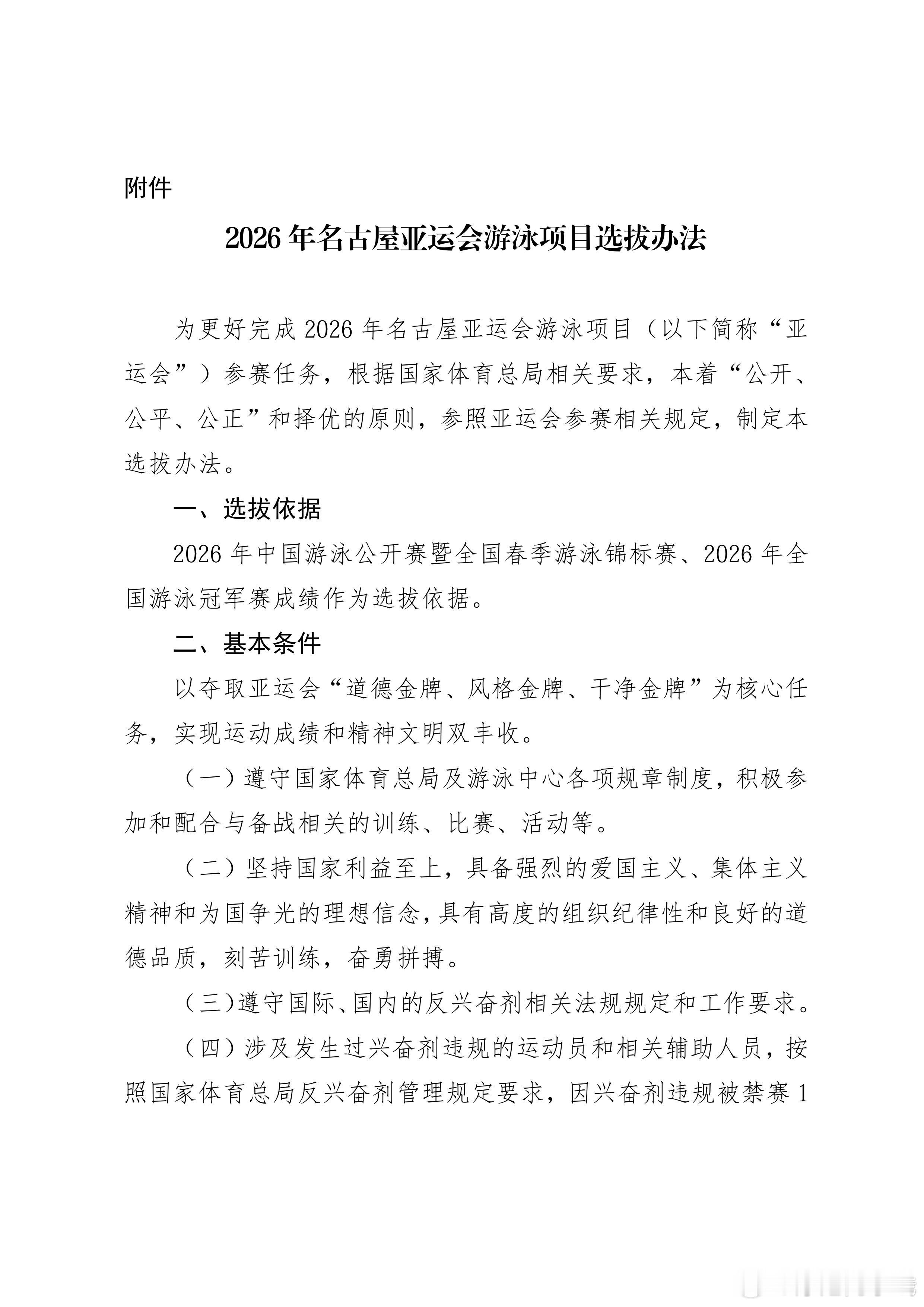 【选拔依据】2026年中国游泳公开赛暨全国春季游泳锦标赛、2026年全国游泳冠军赛成绩作为选拔依据