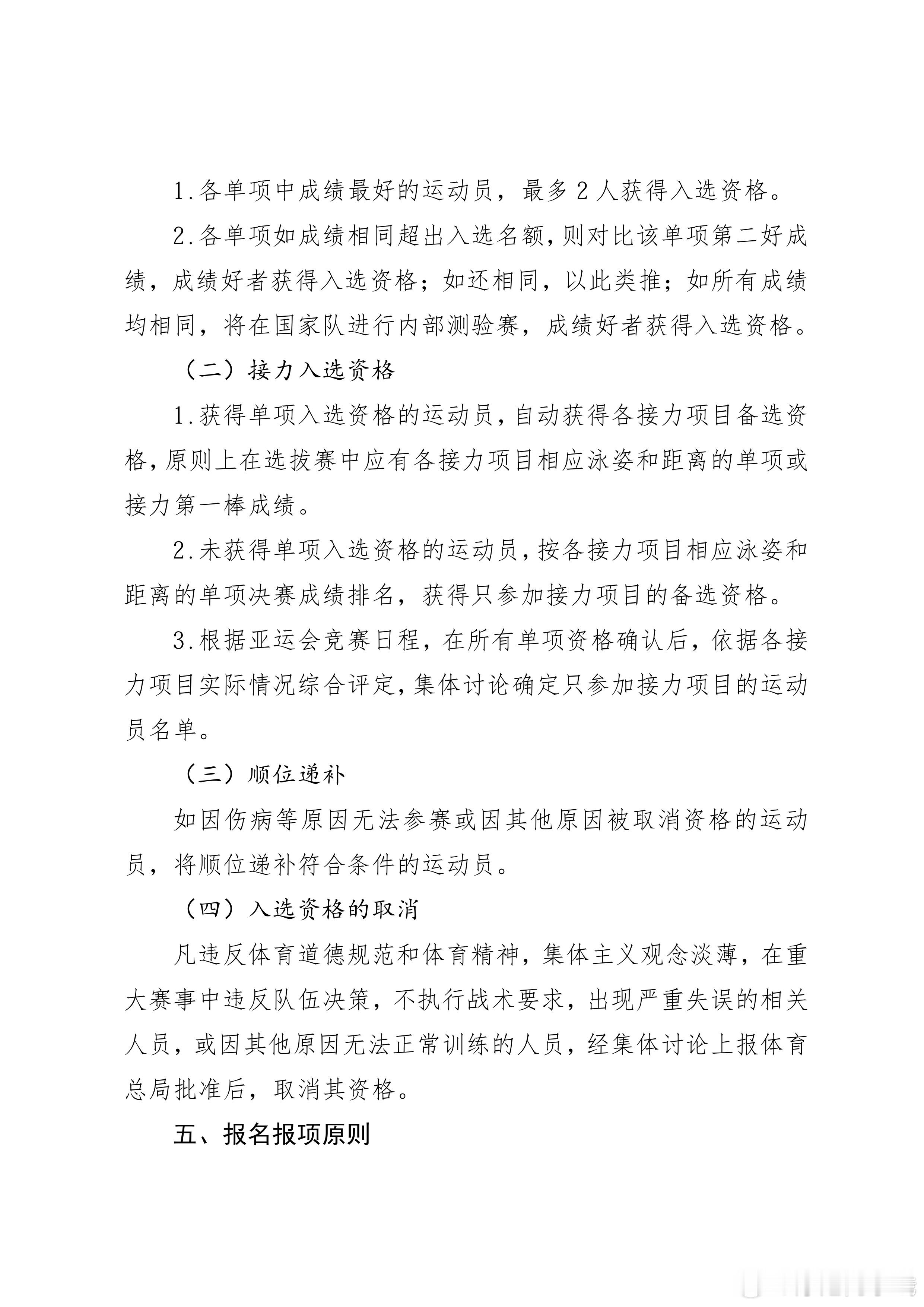 【接力入选资格】1. 获得单项入选资格的运动员,自动获得各接力项目备选资格,原则上在选拔赛中应有各接力项目相应泳姿和距离的单项或接力第一棒成绩。2. 未获得单项入选资格的运动员,按各接力项目相应泳姿和距离的单项决赛成绩排名,获得只参加接力项目的备选资格。3. 根据亚运会竞赛日程,在所有单项资格确认后,依据各接力项目实际情况综合评定,集体讨论确定只参加接力项目的运动员名单。