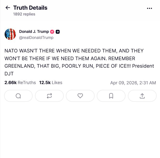 北约在我们需要它的时候没有出手,以后如果我们再次需要它,它也不会出手。记住格陵兰岛,那个管理不善的大冰块!!!, — 美国总统唐纳德·特朗普在与北约秘书长马克·鲁特会面后,在 Truth Social 上发布了一条愤怒的帖子,再次全程使用大写字母。