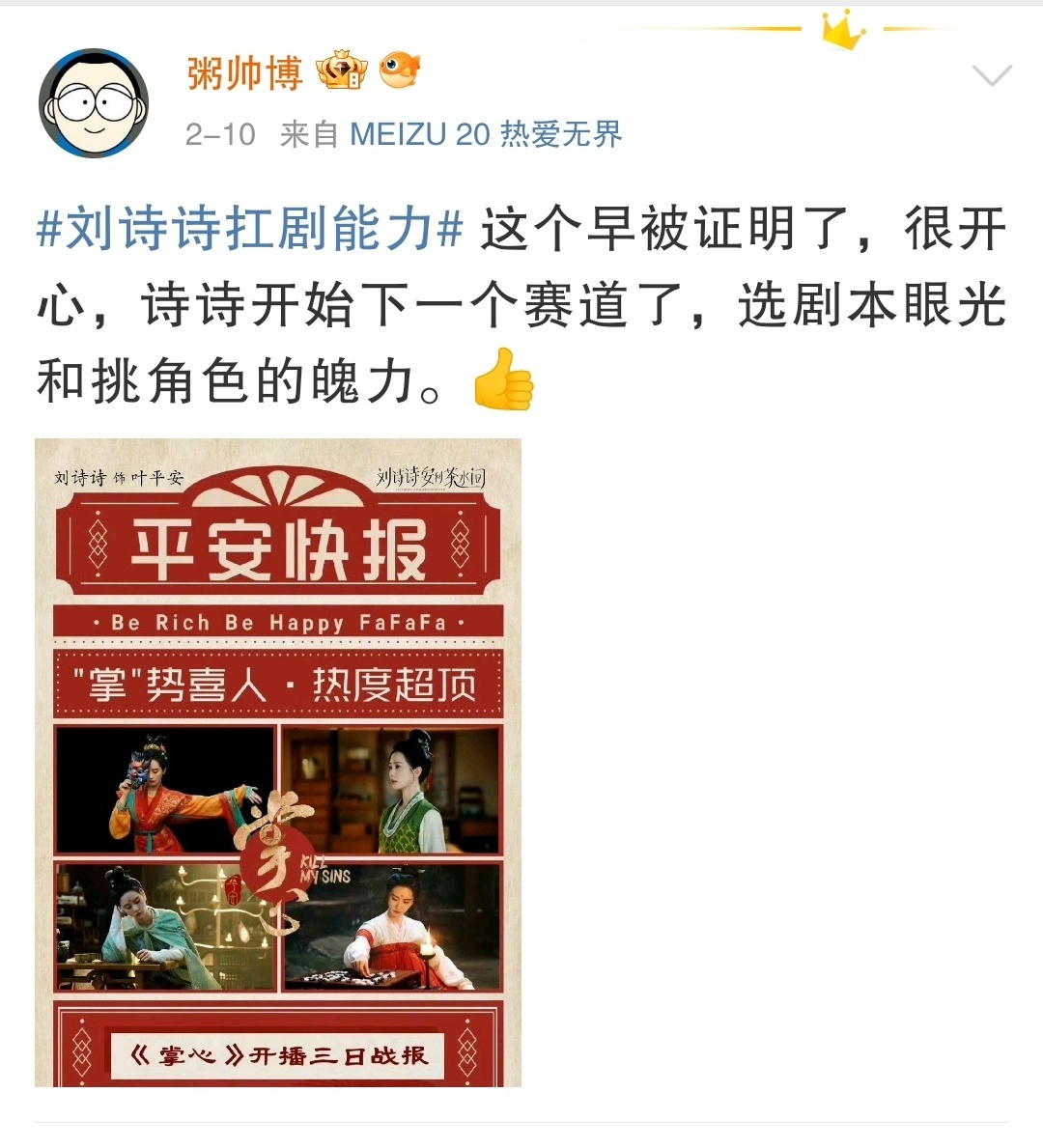 真的越来越佩服刘诗诗的强大掌心灯塔系数0.59 云合集均1200W➕ 酷云集均1500W➕半年三轮上星 多轮海外播出 制作方和剧组表示感谢,认可刘诗诗的扛剧能力,上财报姐默不作声扛起一切,出来的成绩名列前茅,想想她真的没有抱怨没有卖惨,有的只是凭作品说话