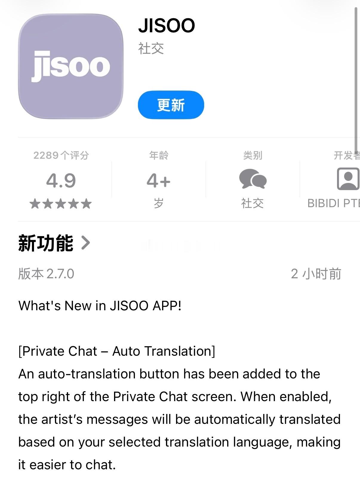 JISOO APP更新:在私人聊天屏幕的右上角添加了自动翻译按钮。 启用后,艺人的信息将根据您选择的语言自动翻译,以便于聊天。