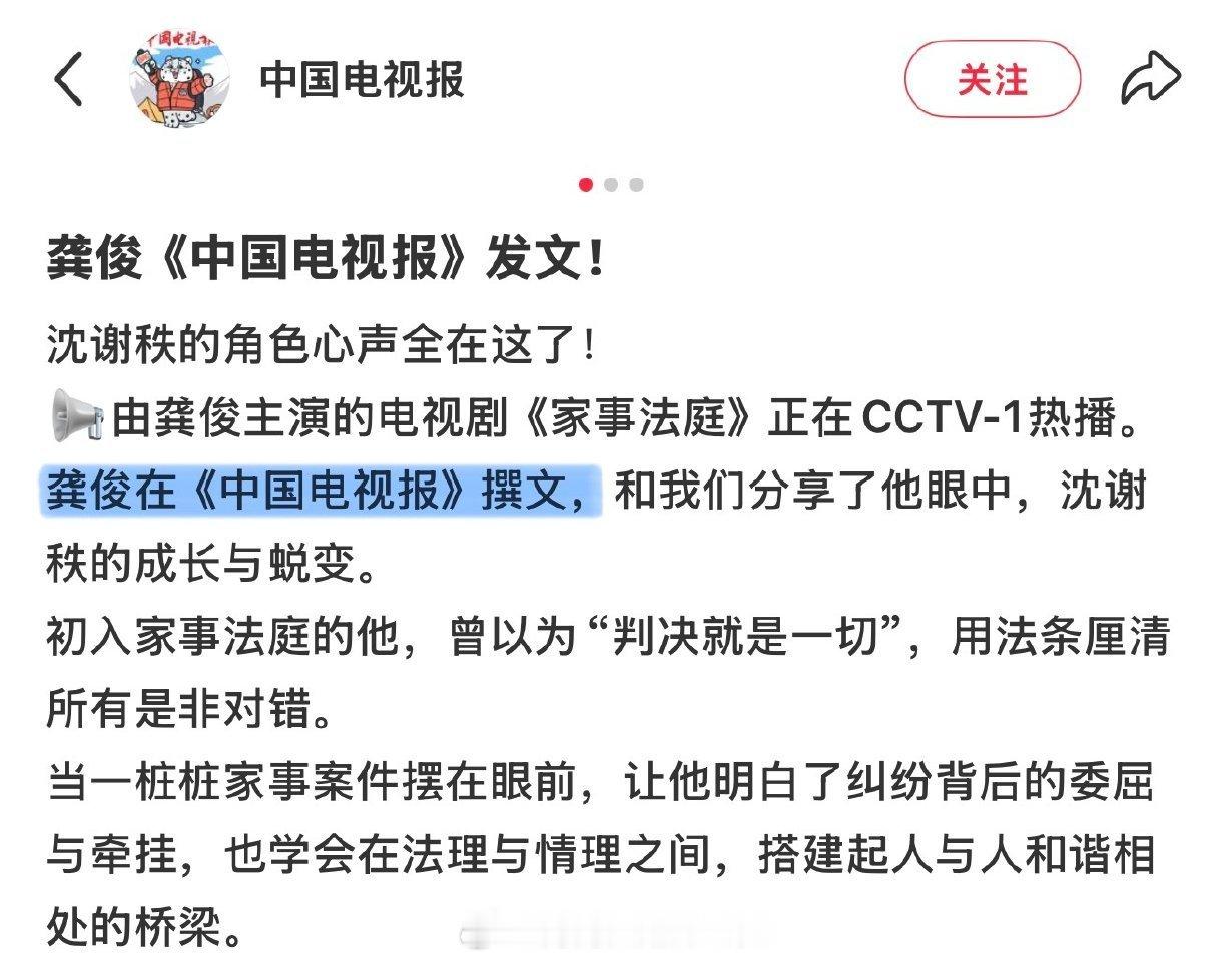 今天《中国电视报》单独报道了龚俊!家事法庭在央视总台播出,今天登中国电视报文章还是俊子自己写的,好优秀👍