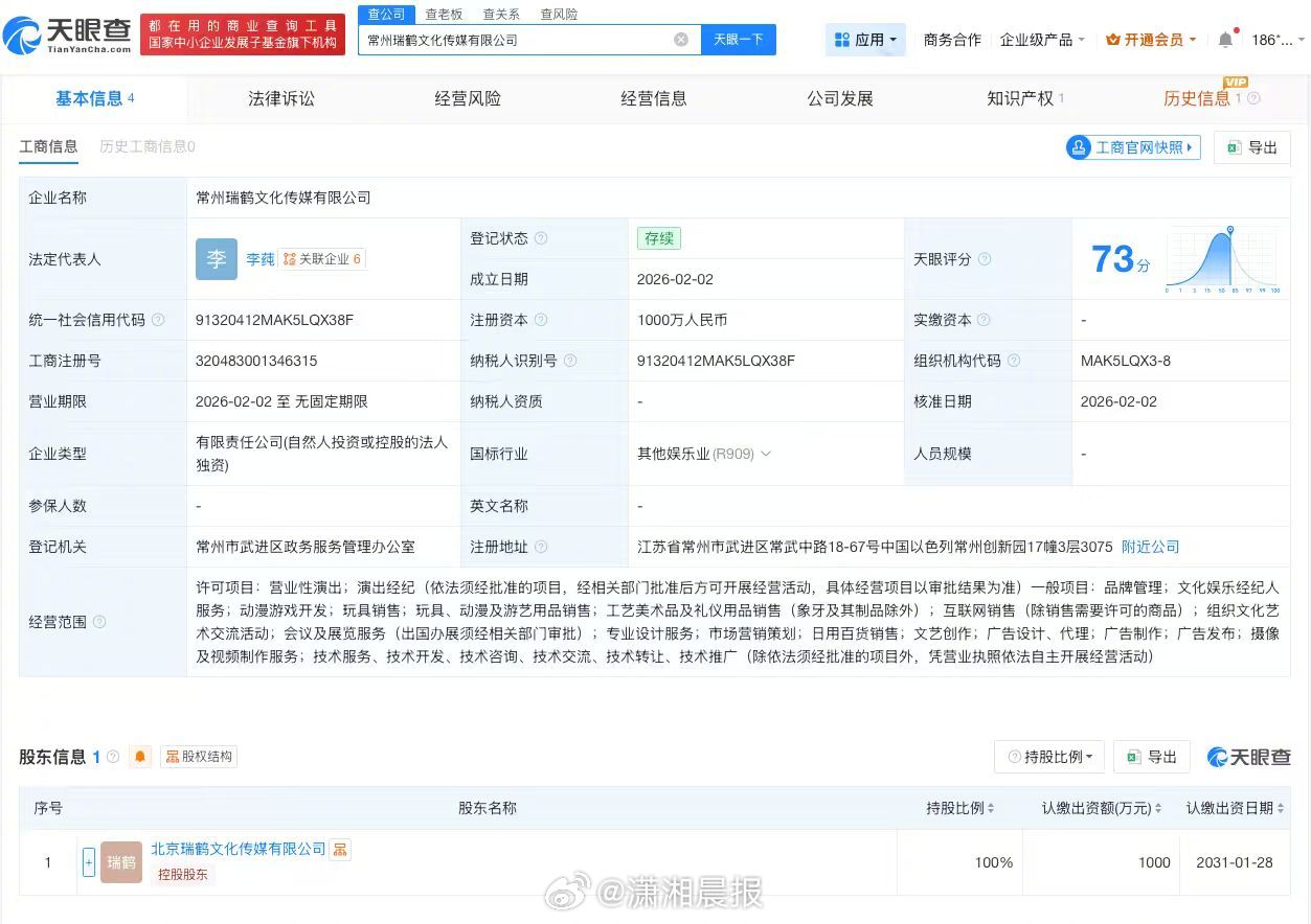 【#梓渝关联公司新增胖头仔Toto著作权#,#瑞鹤登记胖头仔Toto著作权#】记者查询天眼查知识产权信息发现,近日,梓渝关联公司常州瑞鹤文化传媒有限公司登记“胖头仔Toto”作品著作权,作品类别为美术。常州瑞鹤文化传媒有限公司成立于2026年2月,法定代表人为李莼,注册资本1000万人民币,经营范围包括营业性演出、演出经纪、互联网销售等,由北京瑞鹤文化传媒有限公司全资持股。梓渝