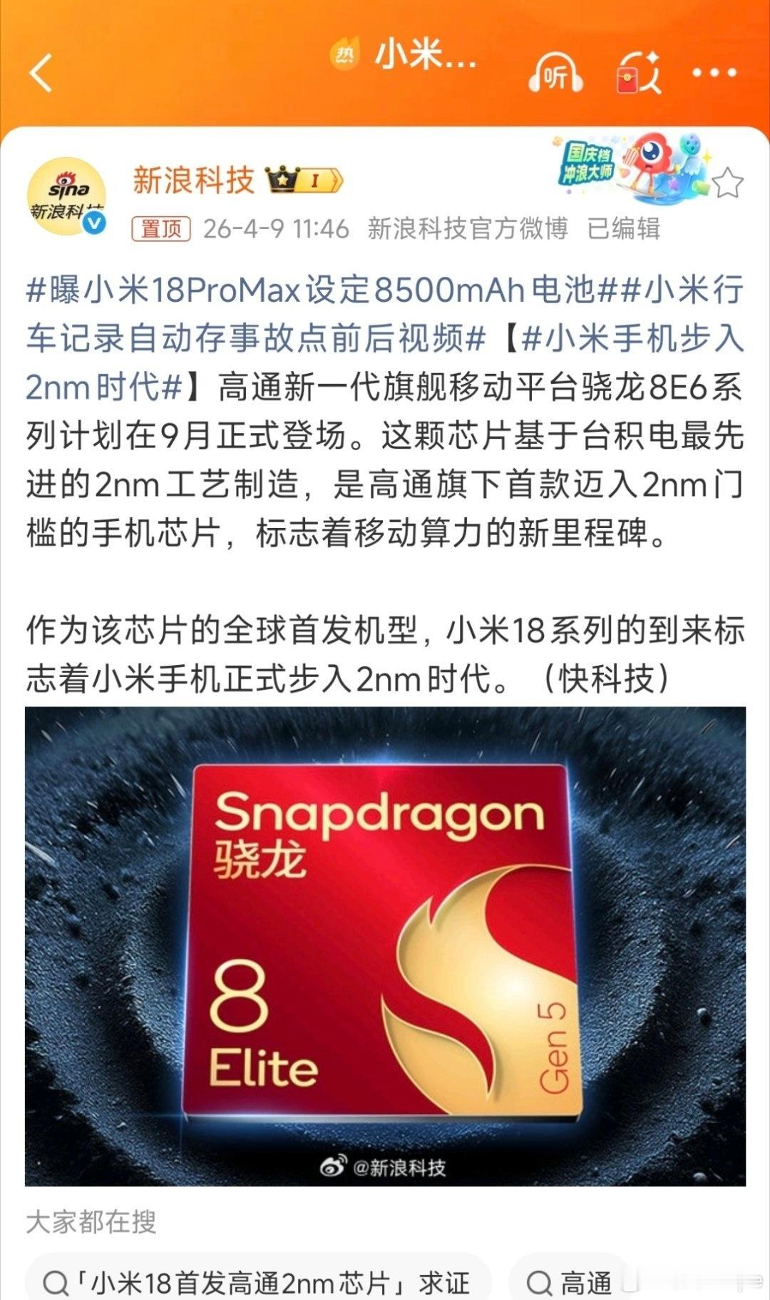 曝小米18ProMax设定8500mAh电池小米手机步入2nm时代高通旗舰芯片基