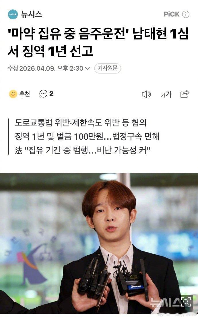 南太铉一审被判1年有期徒刑 首尔西部地方法院对南太铉酒驾案作出一审判决,判处1年