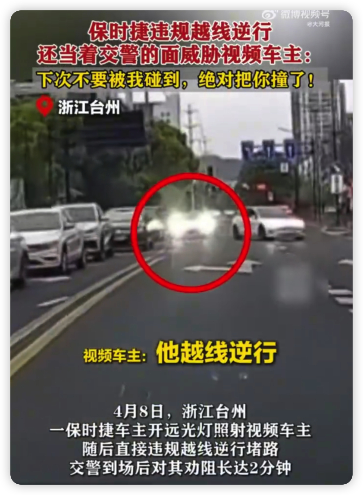 男子被保时捷车主当交警面威胁开着保时捷逆着行,打着远光灯照着人,还得当面骂一句要