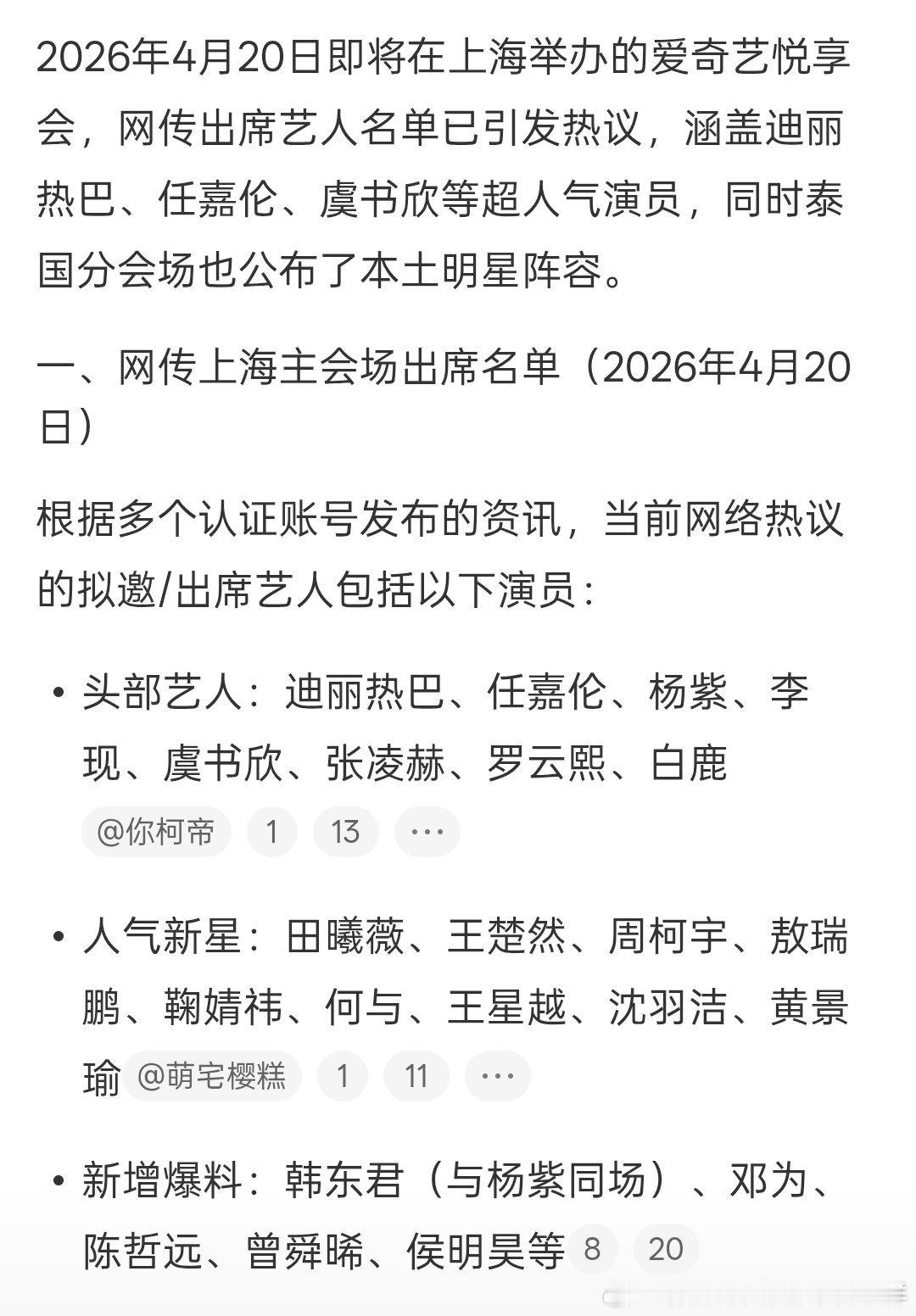 爱奇艺悦享会网传出席艺人🈶敖瑞鹏已经确认✓,其他呢