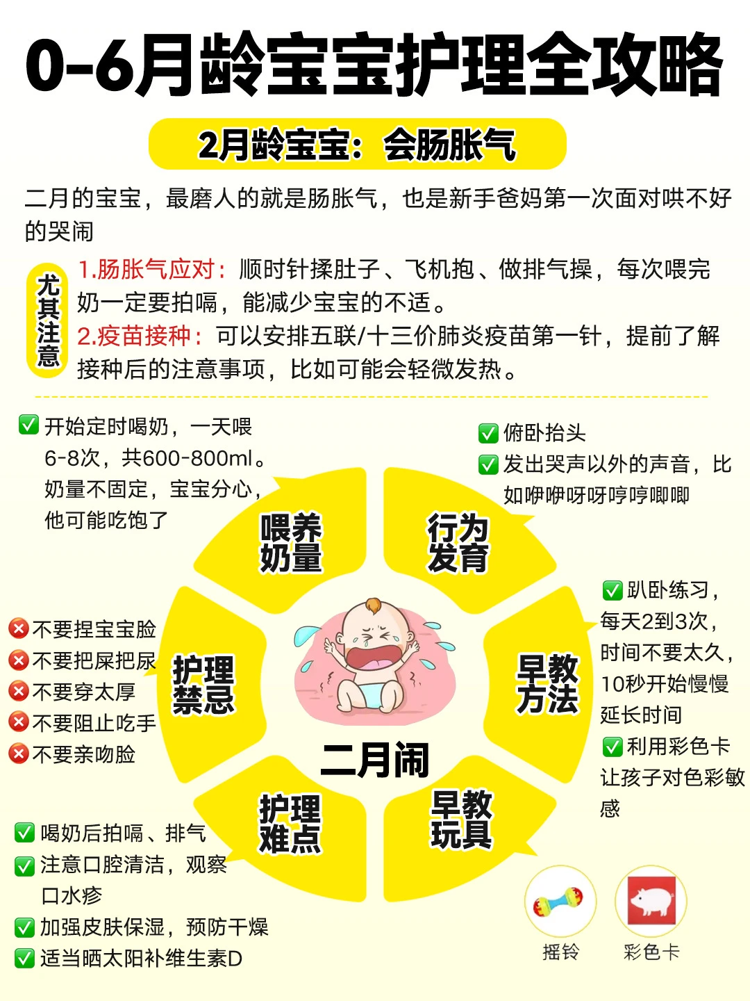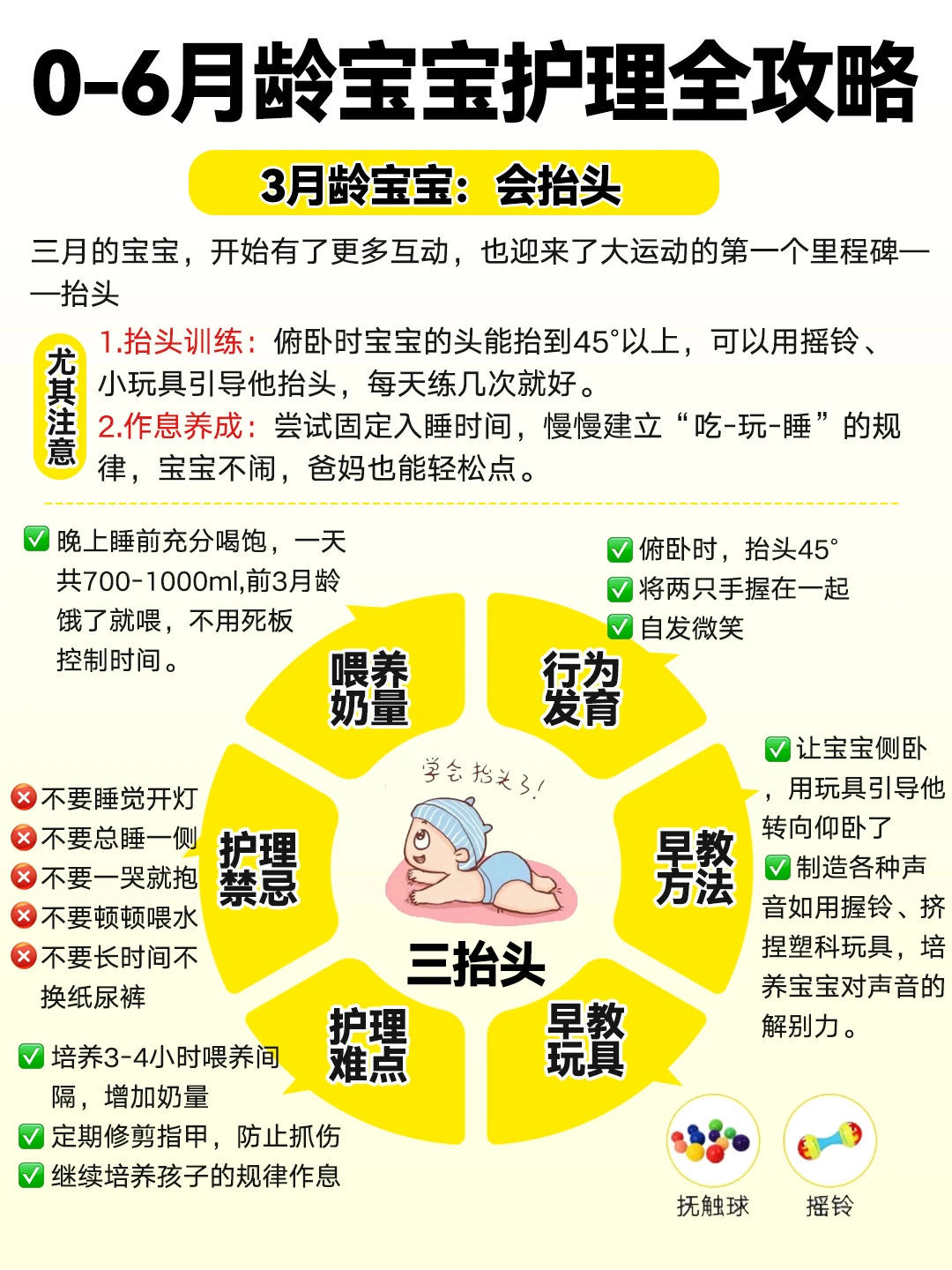 ❷奶后半小时练抬头,摇铃引导,能抬45°即可,少量多次、不哭闹为前提