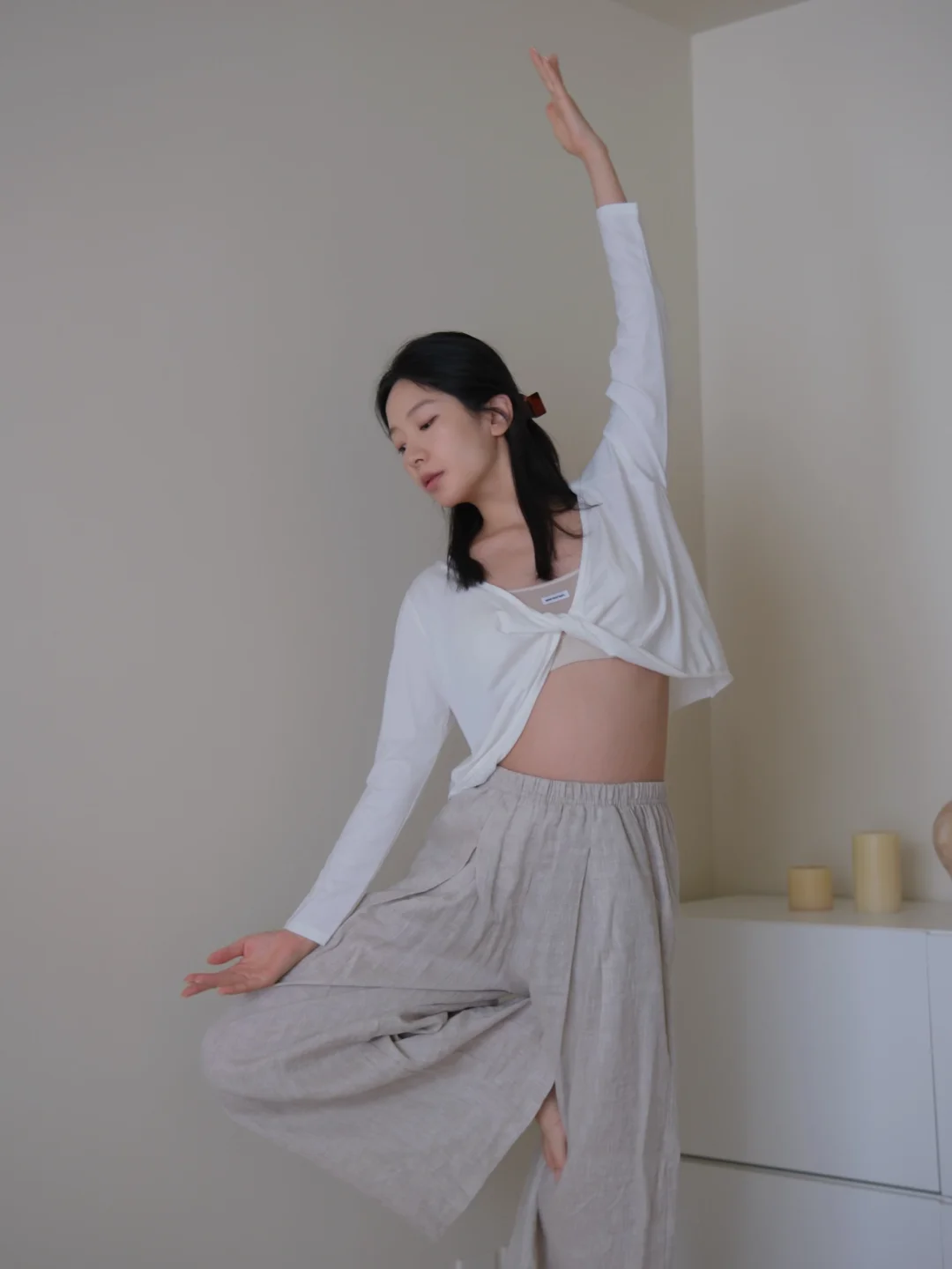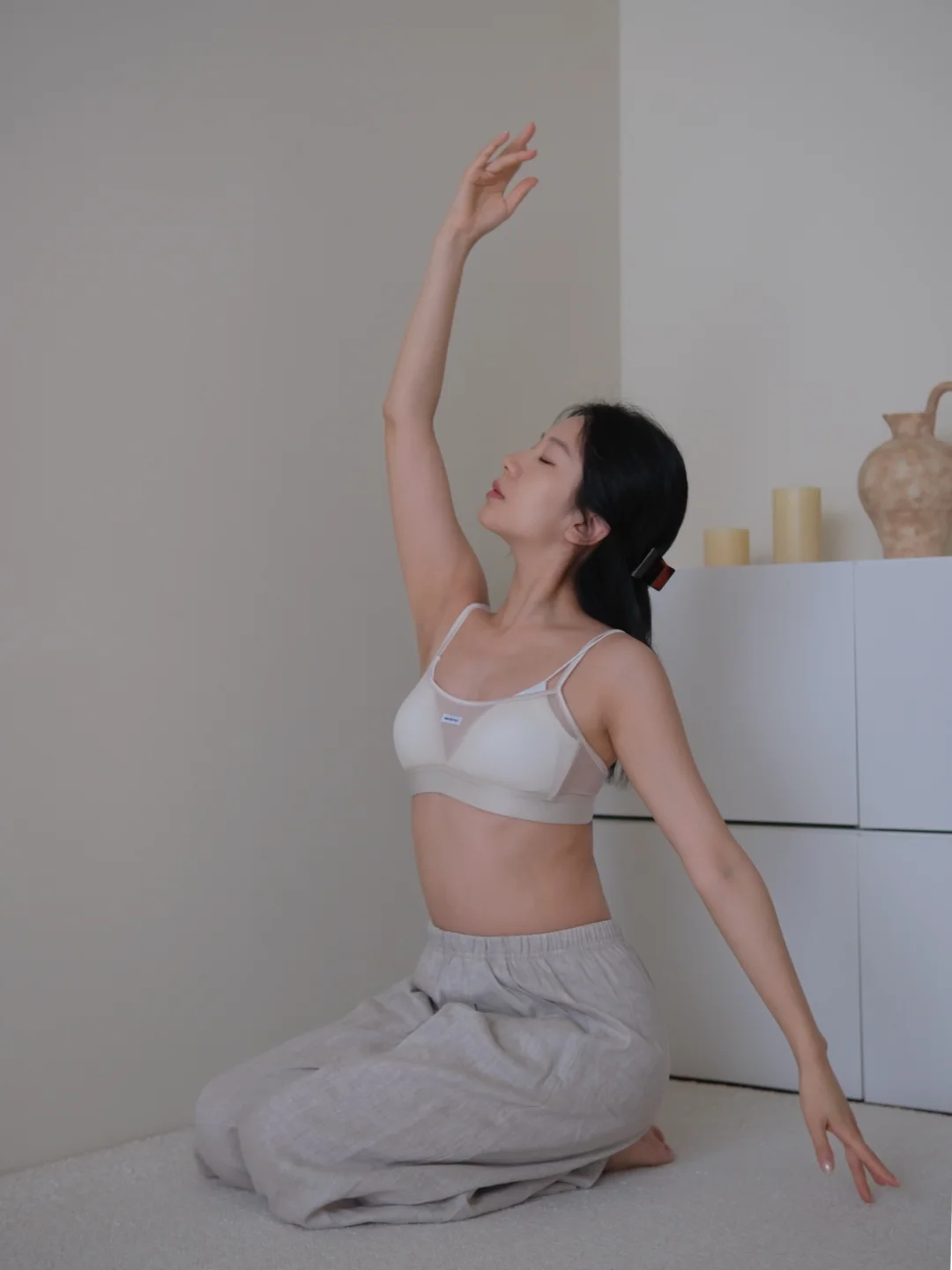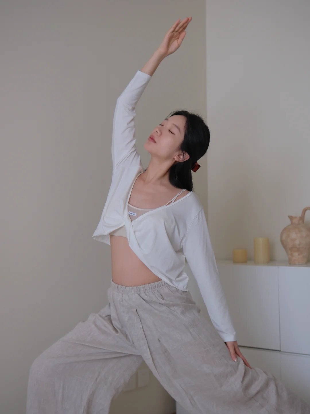 下午睡醒后 穿着舒适的运动内衣和亚麻长裤