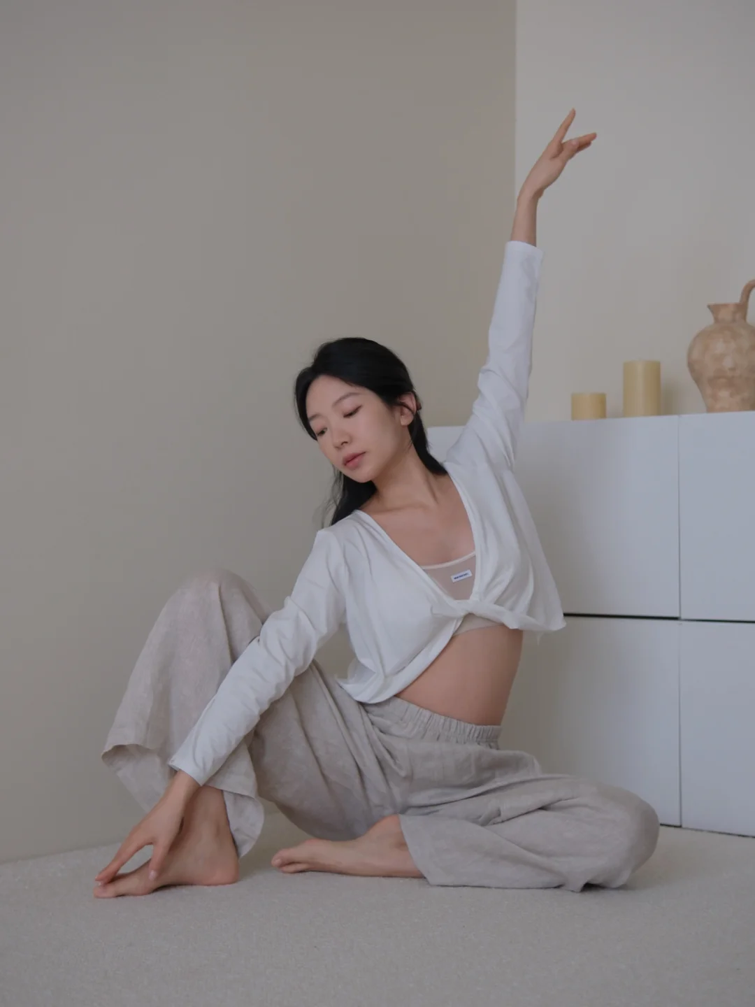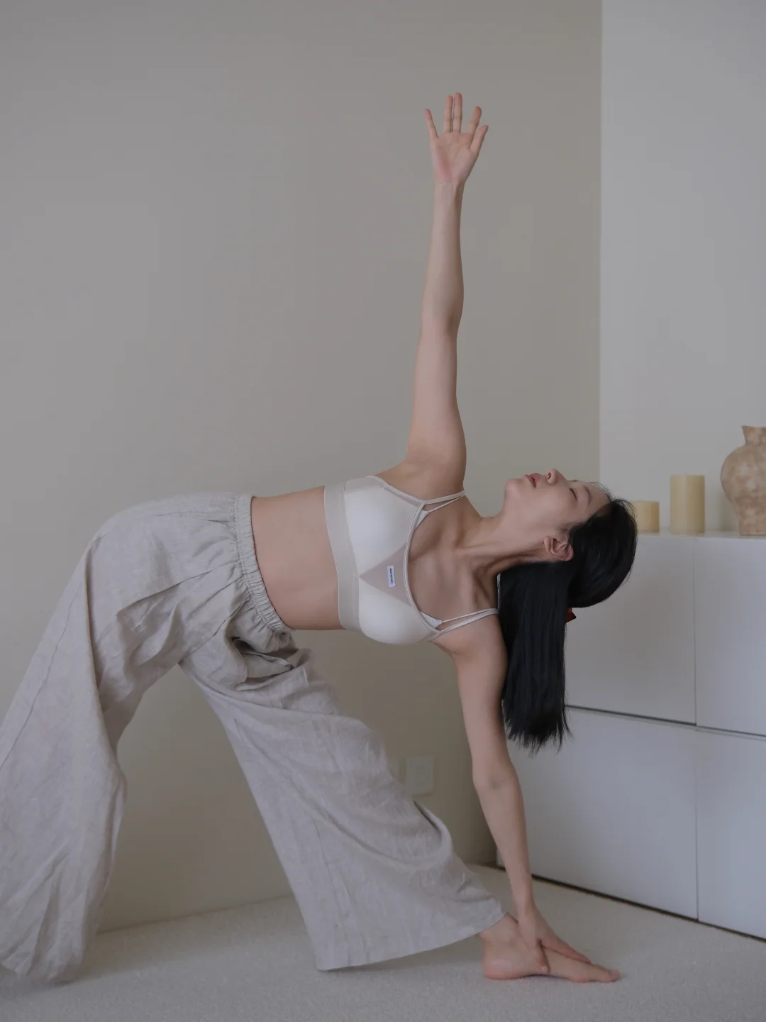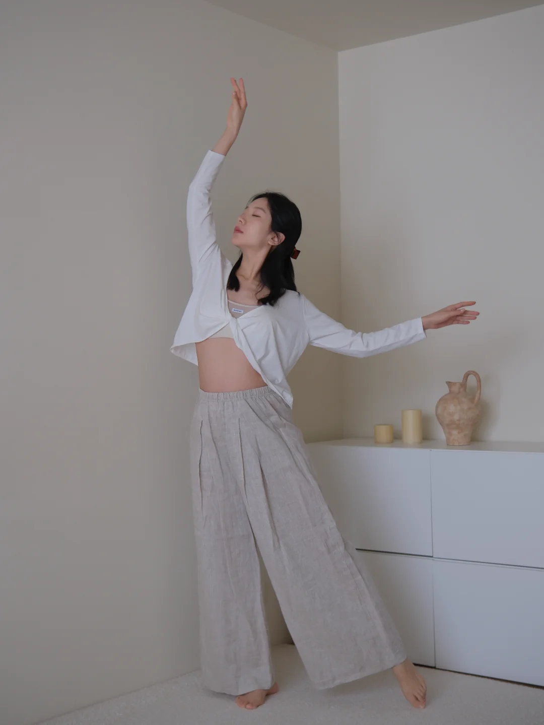 下午睡醒后 穿着舒适的运动内衣和亚麻长裤
