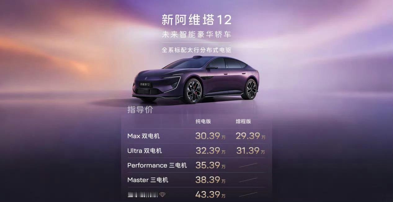 新阿维塔12 售价30.39万元起。其中,纯电版皇家剧院版售价43.39万元!阿