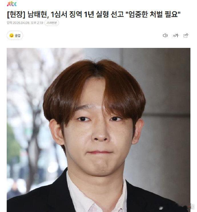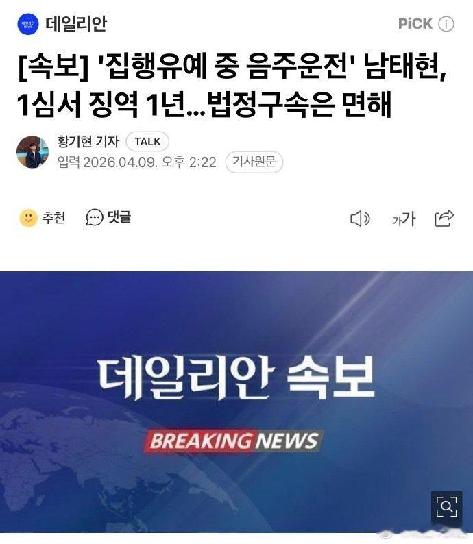 南太铉一审被判1年有期徒刑 南太铉酒驾案一审宣判。去年4月他酒后驾车在铜雀大桥附近撞上中央隔离带,血液酒精浓度已达吊销驾照标准。法院判处其1年有期徒刑,罚款100万韩元。此前他已有酒驾前科,并在涉毒缓刑期间再犯。