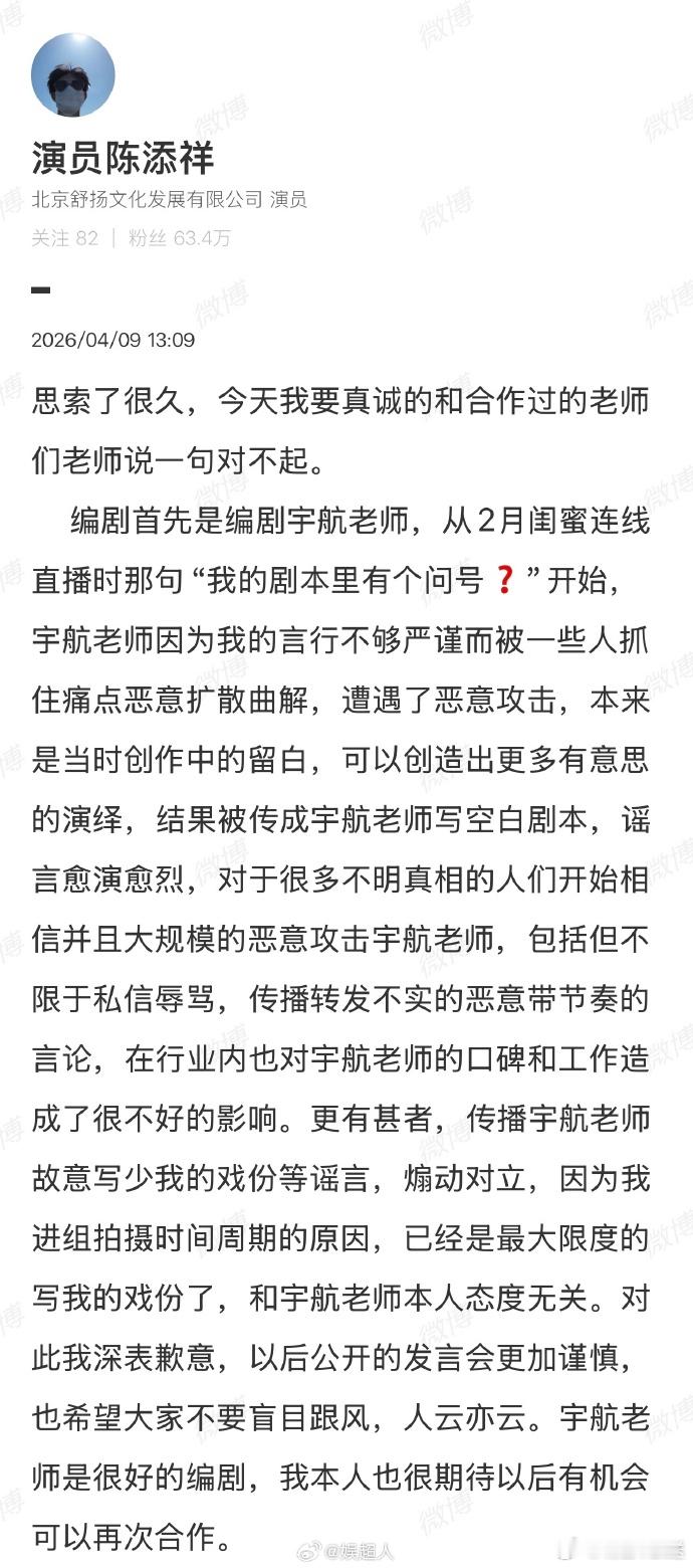 陈添祥有很好的引导粉丝 喜欢他,就一起守住底线:尊重创作、尊重合作、尊重每个认真工作的人。把热爱留给作品,把善意留给人。