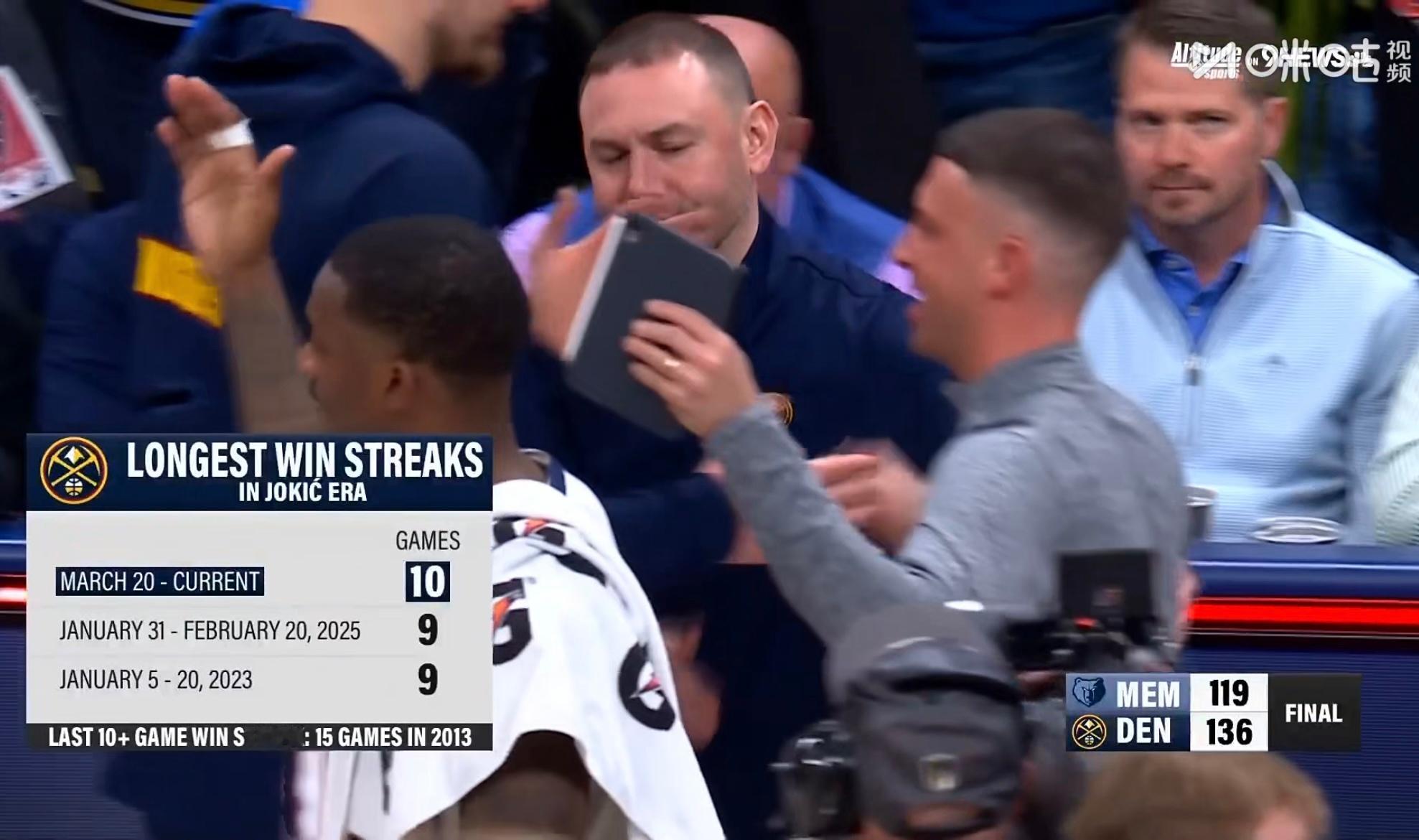 掘金136-119击败灰熊,获得10连胜,进一步巩固了他们西部第三的位置。灰熊v