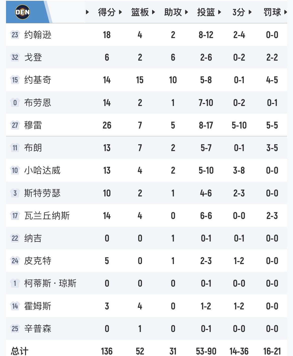 掘金136-119击败灰熊,获得10连胜,进一步巩固了他们西部第三的位置。灰熊vs掘金