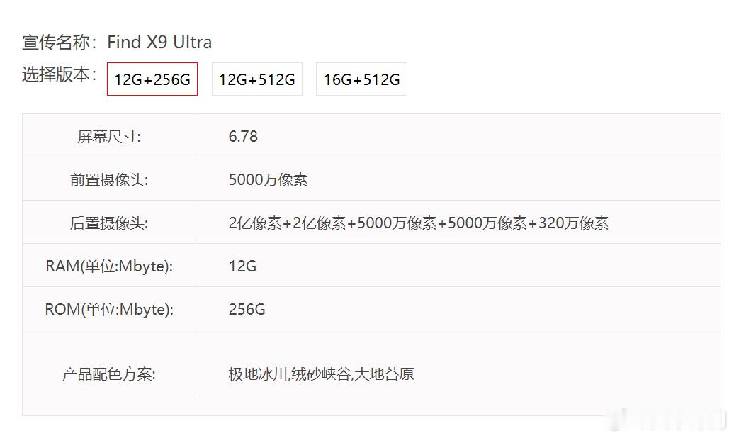 FindX9Ultra 登录中国电信终端产品库,极地冰川、绒砂峡谷、大地苔原三个配色,这个橙色应该就是绒砂峡谷配色了,后摄相机盖板不是圆形,而是多边形。2亿像素主摄,2亿像素长焦,5000W 10X长焦,5000W超广角,320W多光谱,厚度9.15mm,重量238g,6.78英寸2K屏~ 12+256GB、12+512GB、16+512GB三个版本~(1TB版本,专门给哈苏定制版?)