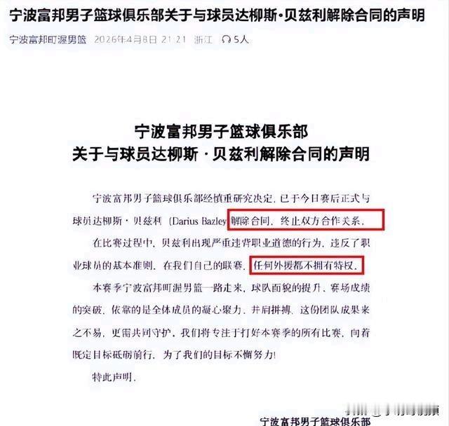 事件起因于一次发球失误导致丢分,贝兹利将怒气发泄在队友辛普森和新秀王凡懿身上,甚至拒绝换人安排,导致场面失控。其技术统计定格为0分0篮板,正负值-9。宁波俱乐部反应果断,未采取内部处理,而是直接发布强硬公告,定性其行为“严重违背职业道德”,并立即终止合作。
