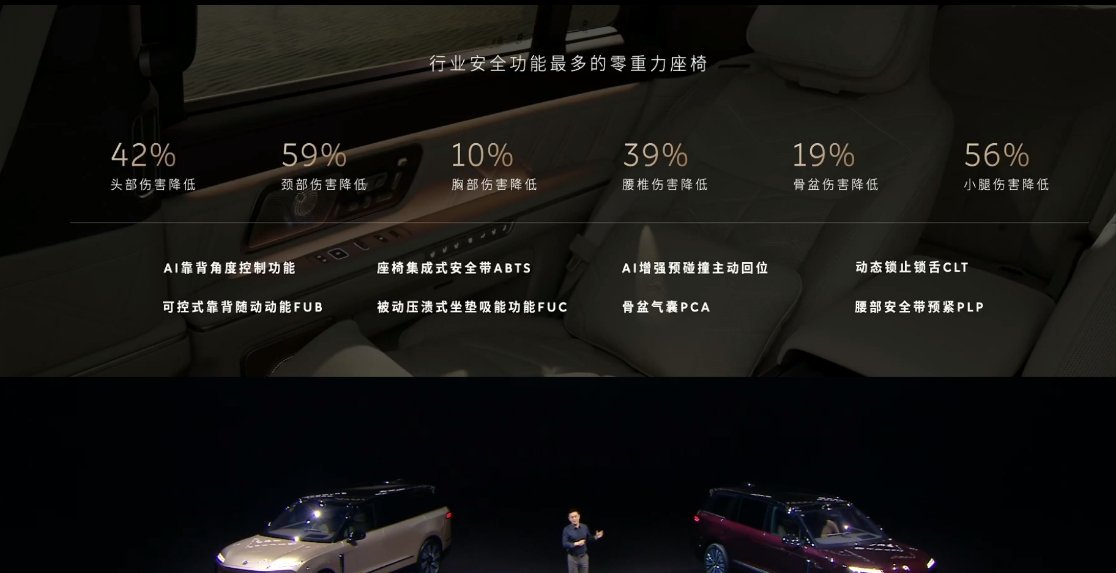 也有针对零重力座姿下的安全冗余设计,包括骨盆气囊和靠背快速回位。