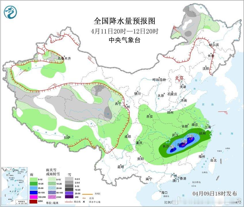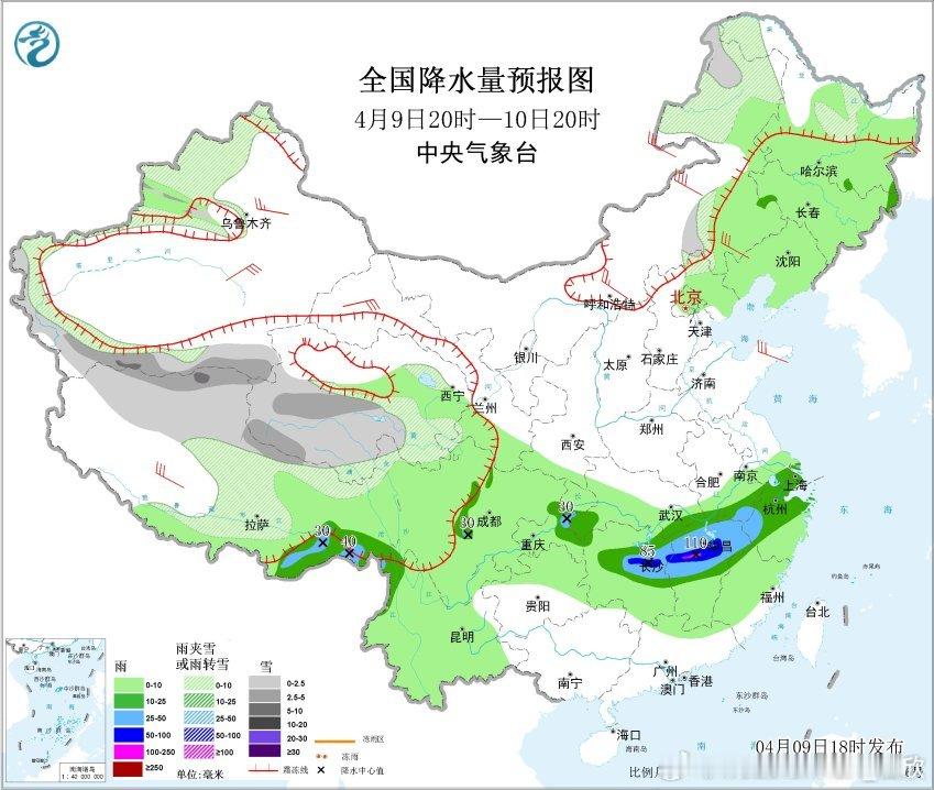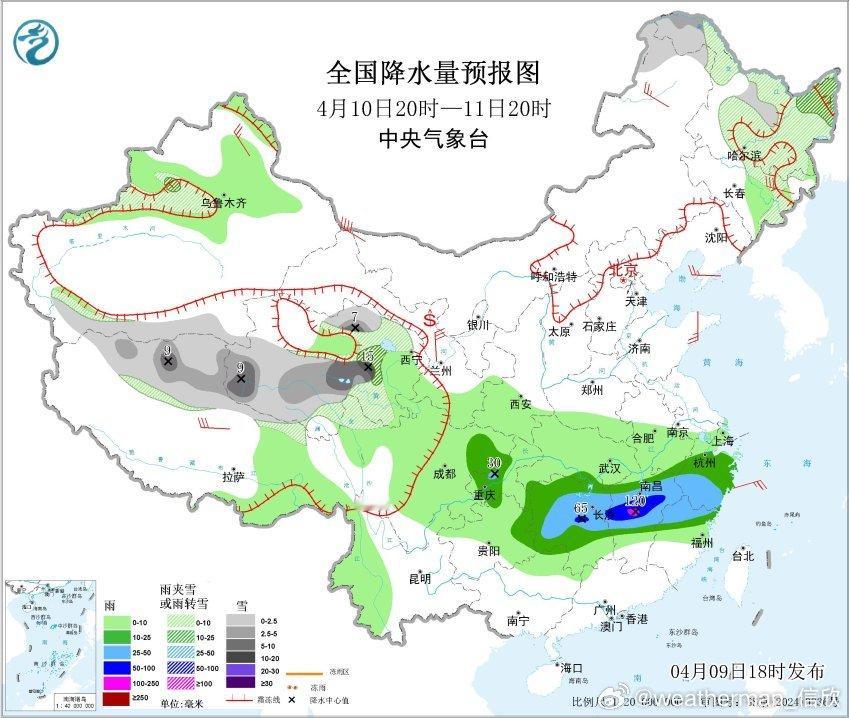 今晚中央气象台继续发布暴雨蓝色预警:预计,4月9日20时至10日20时,西藏东南部、四川中部、重庆东部、安徽南部、湖南东部、江西中北部、浙江西部等地部分地区有大到暴雨,其中,江西中部等地部分地区有大暴雨(100~110毫米)。今晚到明天你的降雨,是冷暖交汇的冷切变降水为主。