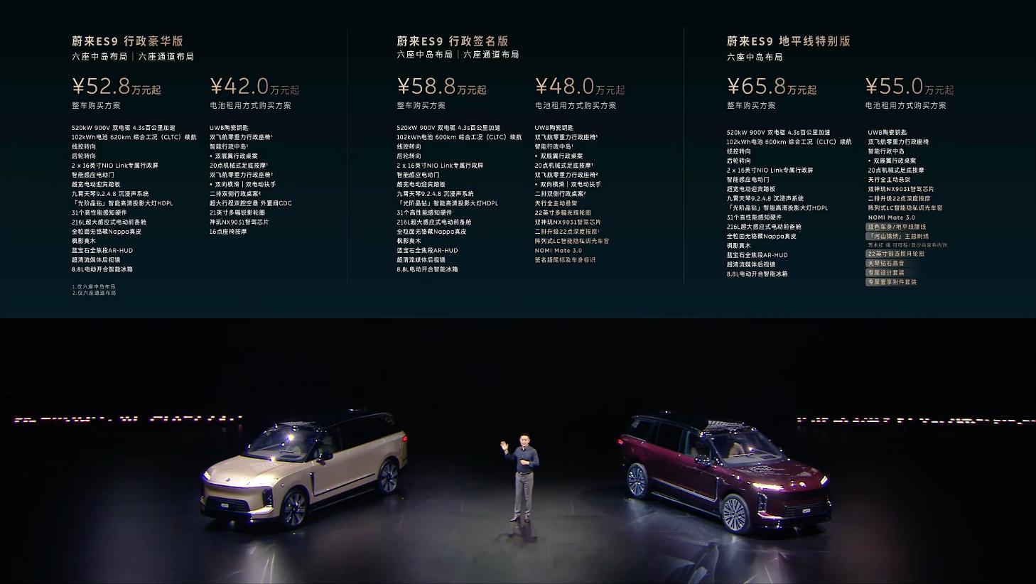 蔚来ES9预售价42-55万元(电池租用)作为蔚来最大的车型,新车定位全尺寸SUV车长宽高分别为5365/2029/1870mm,轴距为3250mm