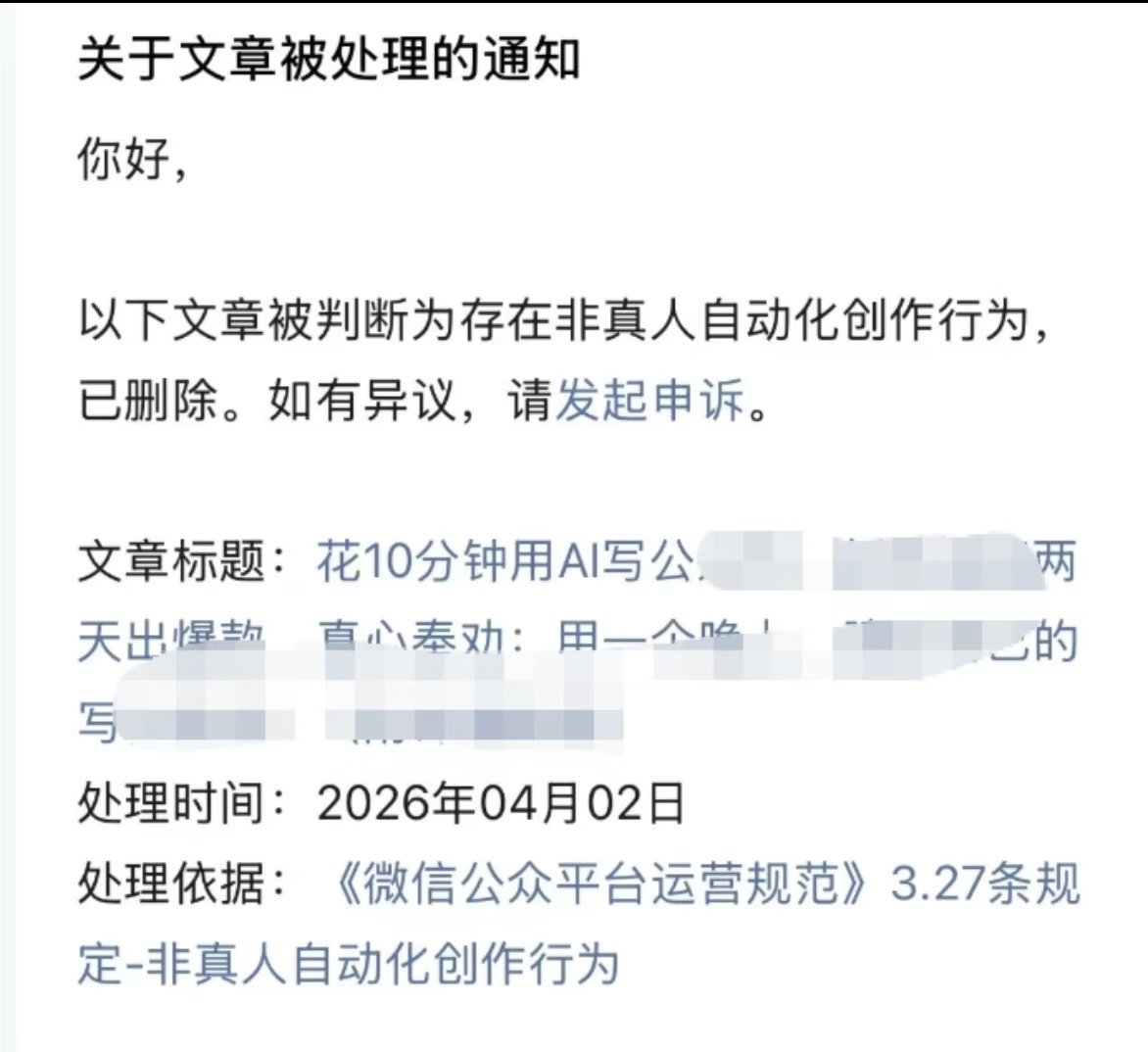 公众号批量删除AI写作文章 公众号现在也是靠流量算法推荐,AI文章破坏了它的基本盘,肯定要打压。但我想不通的是,有时候在A平台首发的原创文章,在B平台再发布,申请原创就申请不过去了,这很不合理!