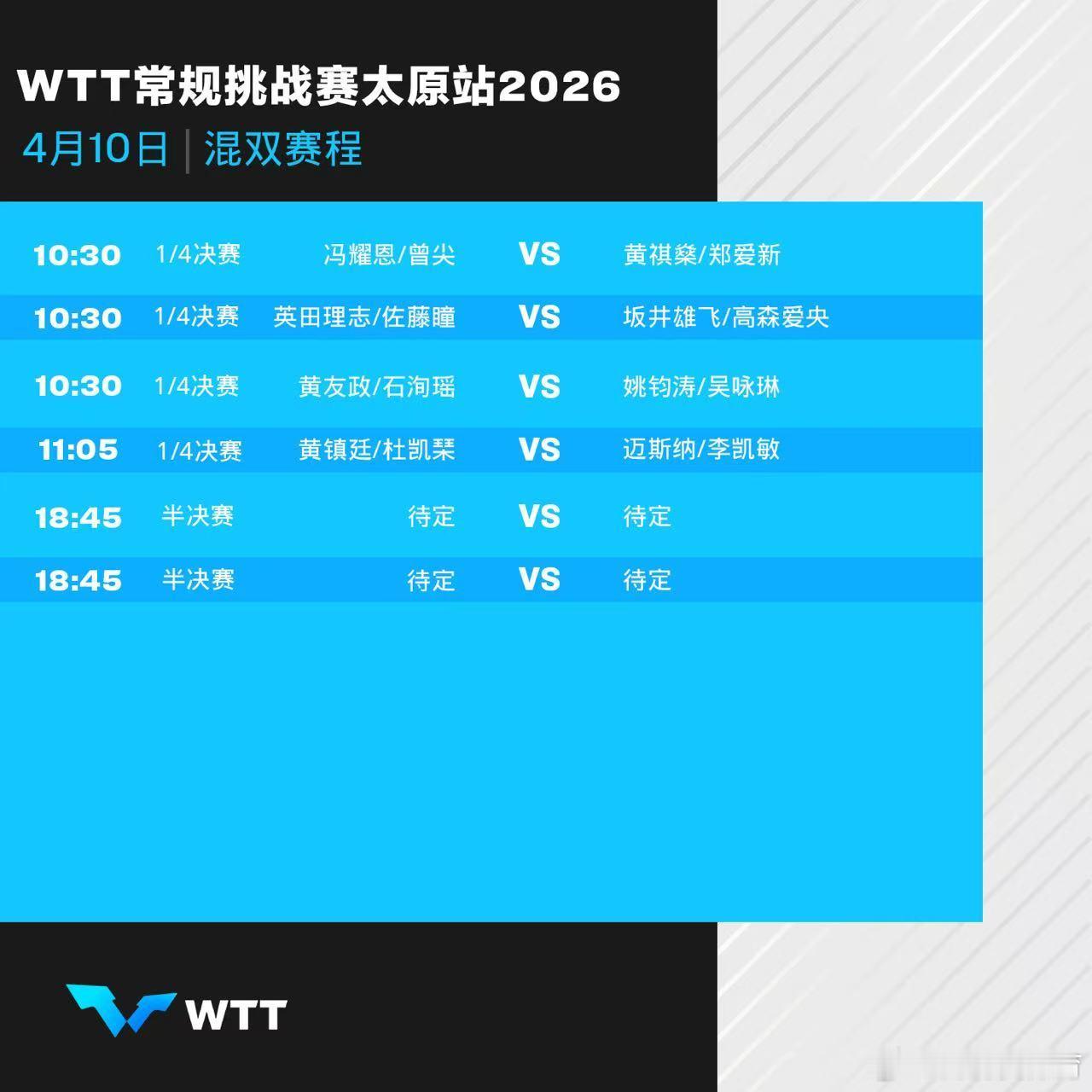 wtt常规挑战赛太原站2026 4月10日赛程。中国乒乓球梦之队