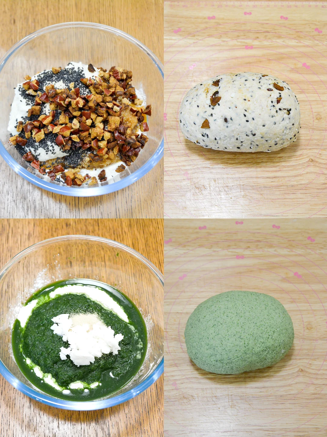1. 两种面团材料分别混合好,揉成无干粉的面团,饧10分钟;