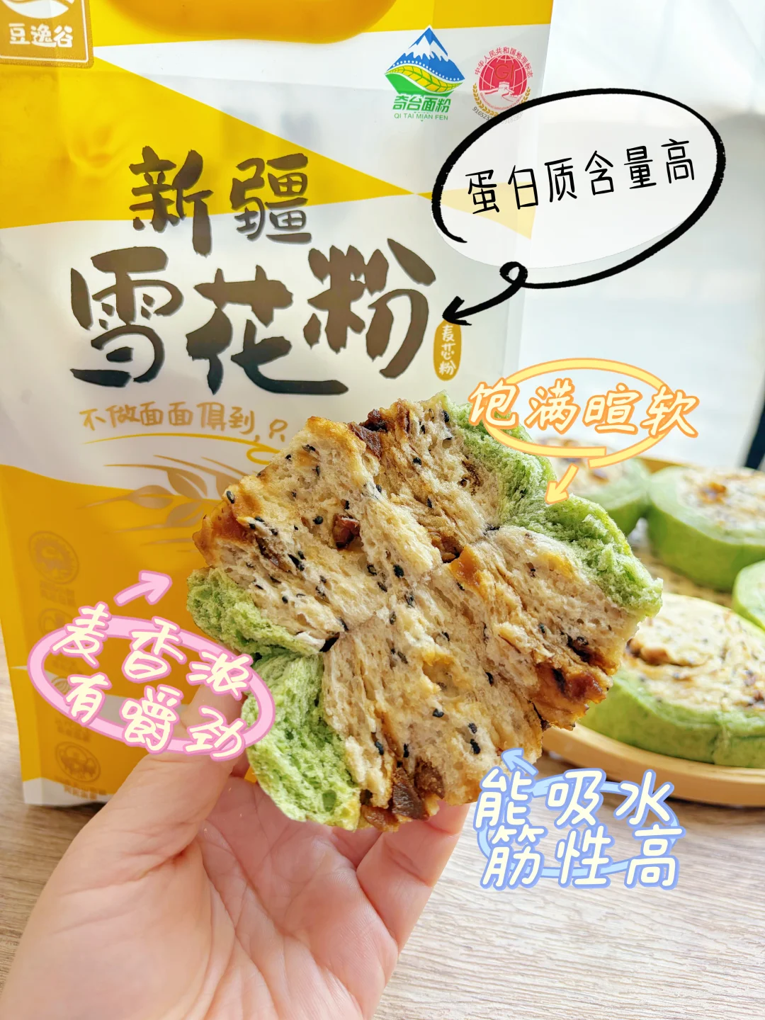 豆逸谷新疆雪花粉从没让我失望过,这款面粉粉质洁白细腻,麦香浓,蛋白质含量高,吸水性好,筋性强,馒头涨发得倍儿饱满,口感暄软有嚼劲。