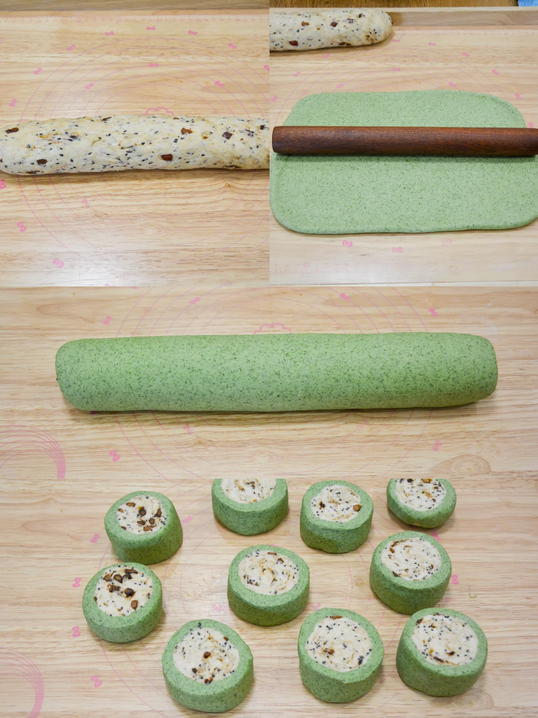 2. 苹果山药红枣面团搓长条,艾草面团擀成长方形面片,长宽要能包裹住前者;