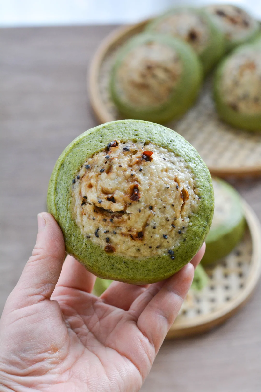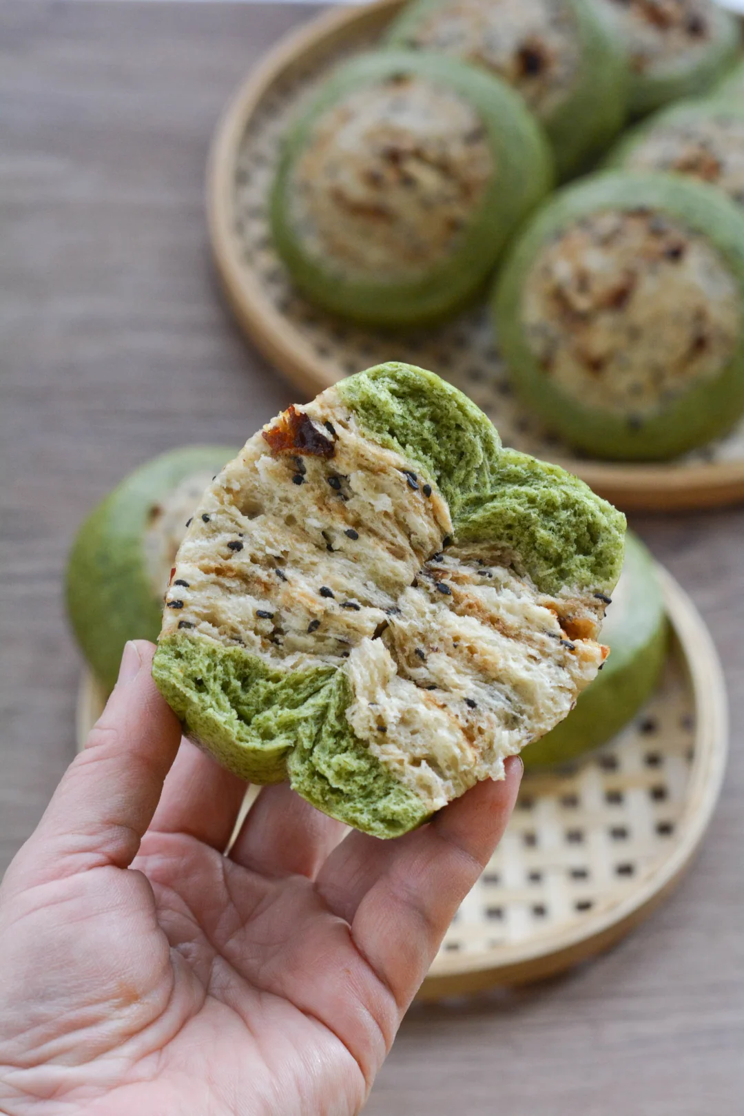 【艾草面团】中筋面粉250克,艾草糊160克,干酵母2.5克,猪油10克