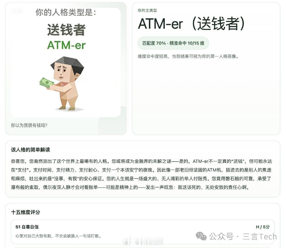 和正经的MBTI不同,SBTI是纯玩梗的荒诞人格测试,结果全是自嘲黑话:狗屎人SHIT、送钱者ATM-er、死者DEAD、吗喽、伪人、自我攻击者……每个都扎心又好笑。