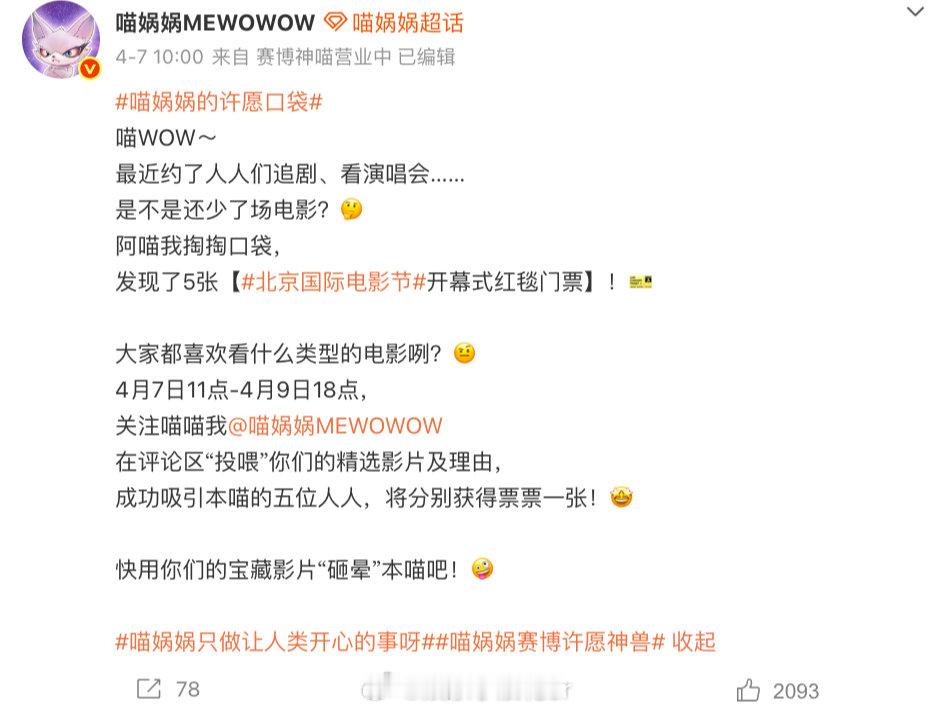喵娲娲又在送门票了 我宣布:喵娲娲是“门票菩萨”!之前送过微博之夜门票,这回北影