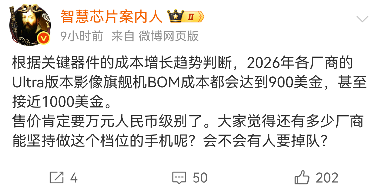 今天下午两个博主都提到手机品牌下一代超大杯迭代问题,由于内存等元器件价格飙升,下一代超大杯价格可能要破万,导致部分品牌可能考虑停更超大杯。