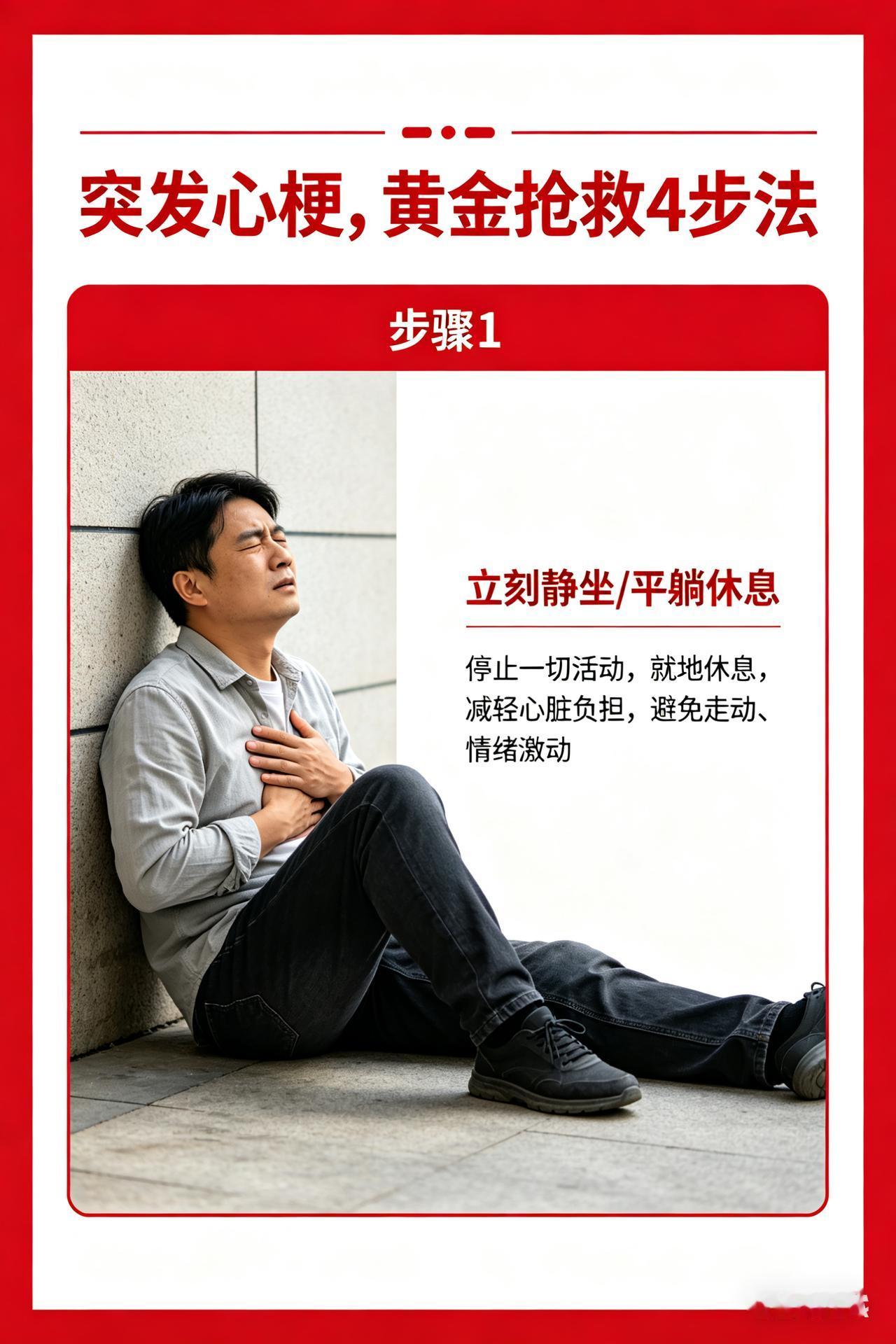 就地休息,保持半卧位(上身垫高)或平卧。任何走动、用力都会加重心脏负担。