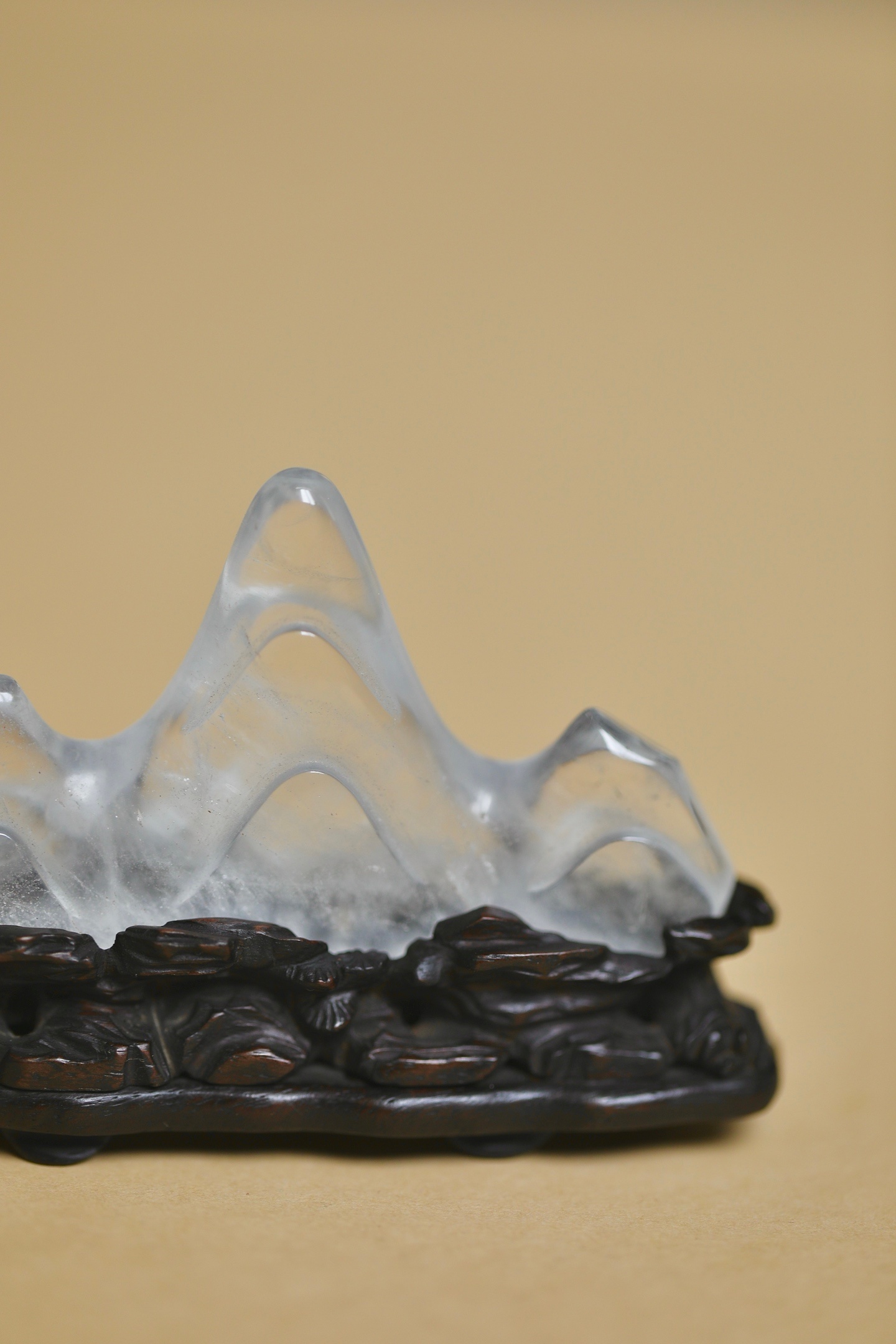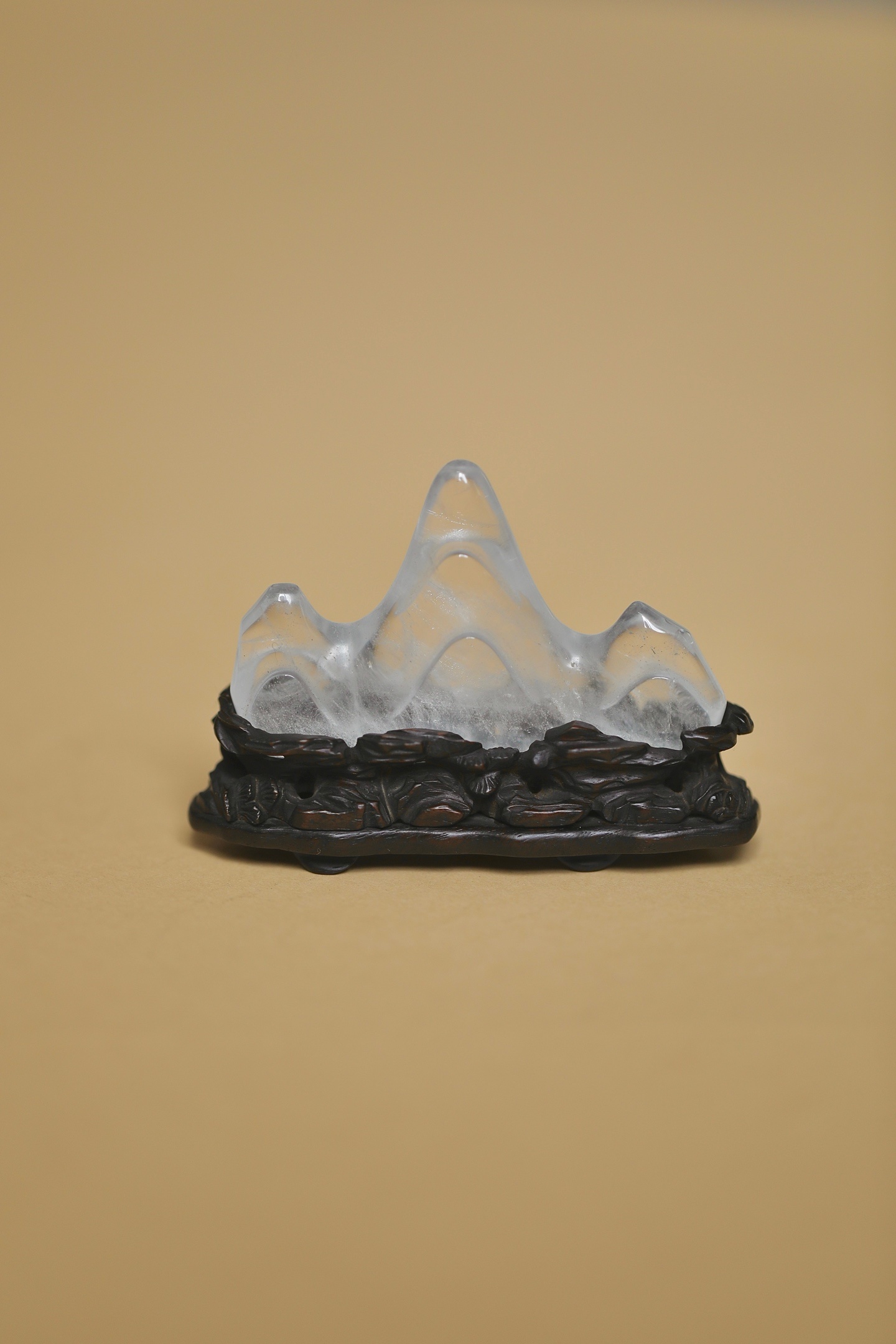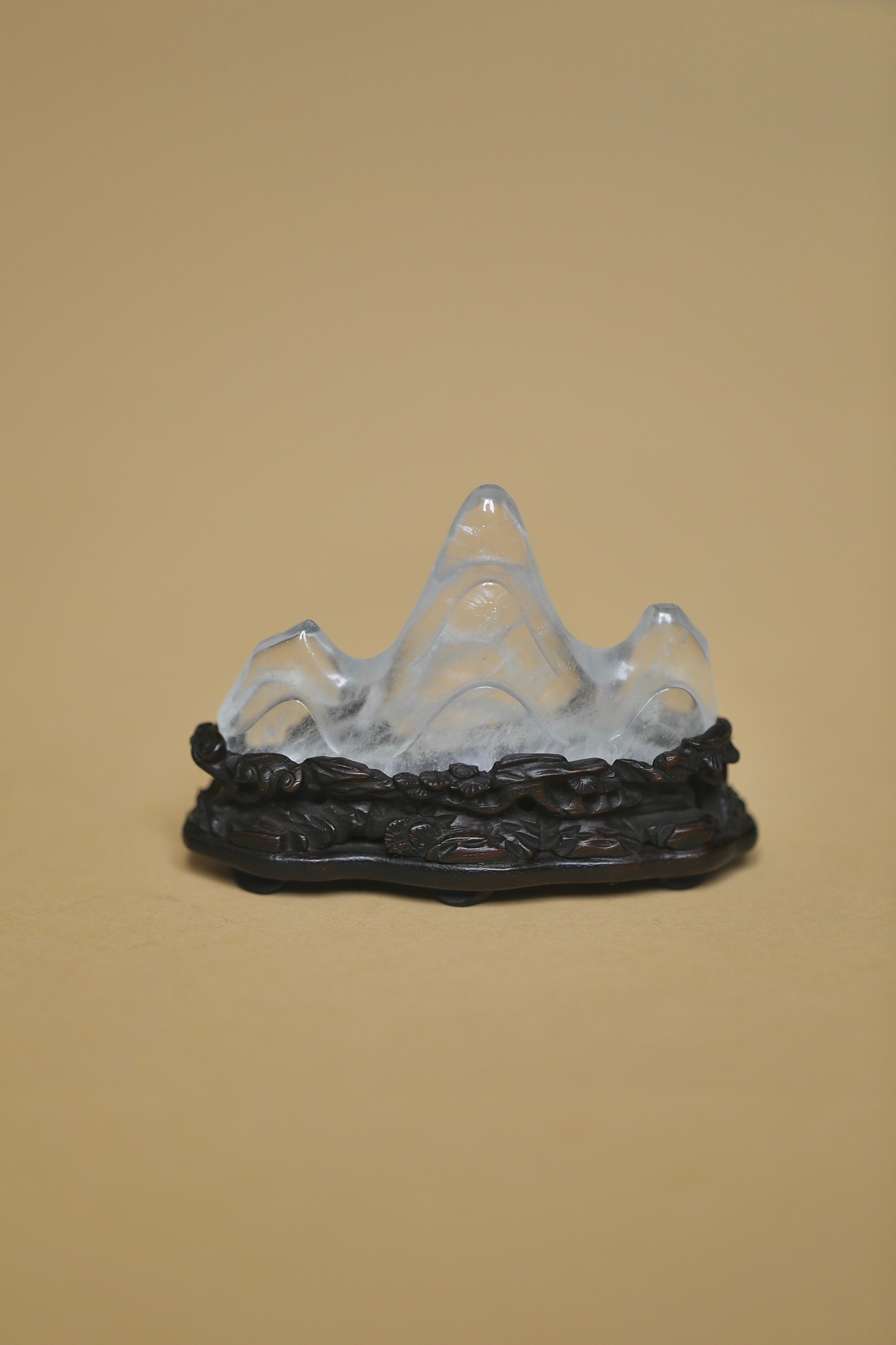 此件笔架以经典三山式为骨,主峰巍峨耸峙,两侧峰峦起伏有致,线条婉转如自然山峦,既合“笔架如山”的传统形制,又藏“远山含黛”的诗意意境。配木底座,雕工细腻,松枝、梅朵、云纹错落有致,包浆温润古雅,与水晶的清透形成刚柔并济的视觉层次,既承托笔山,更添古韵风华。