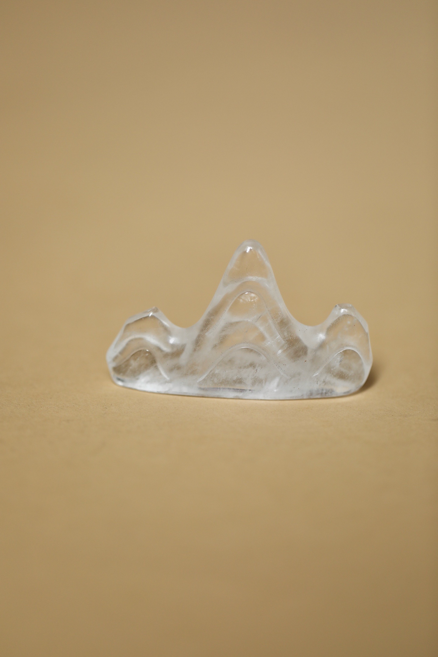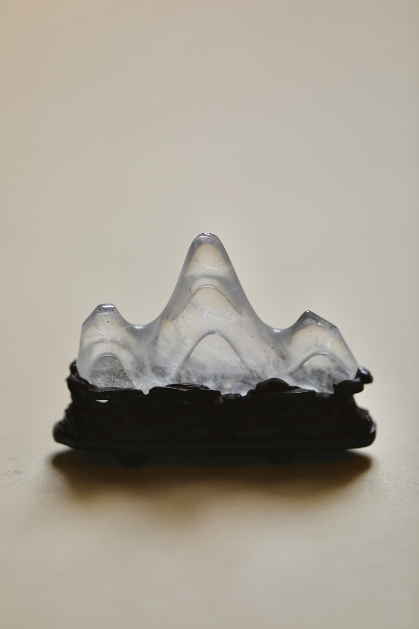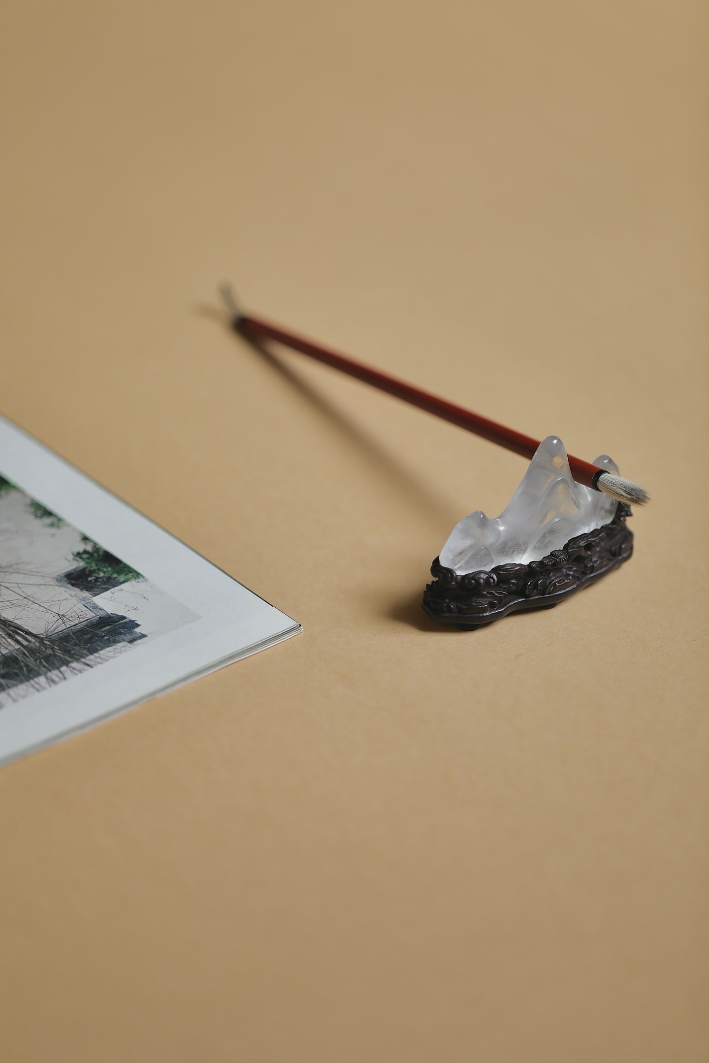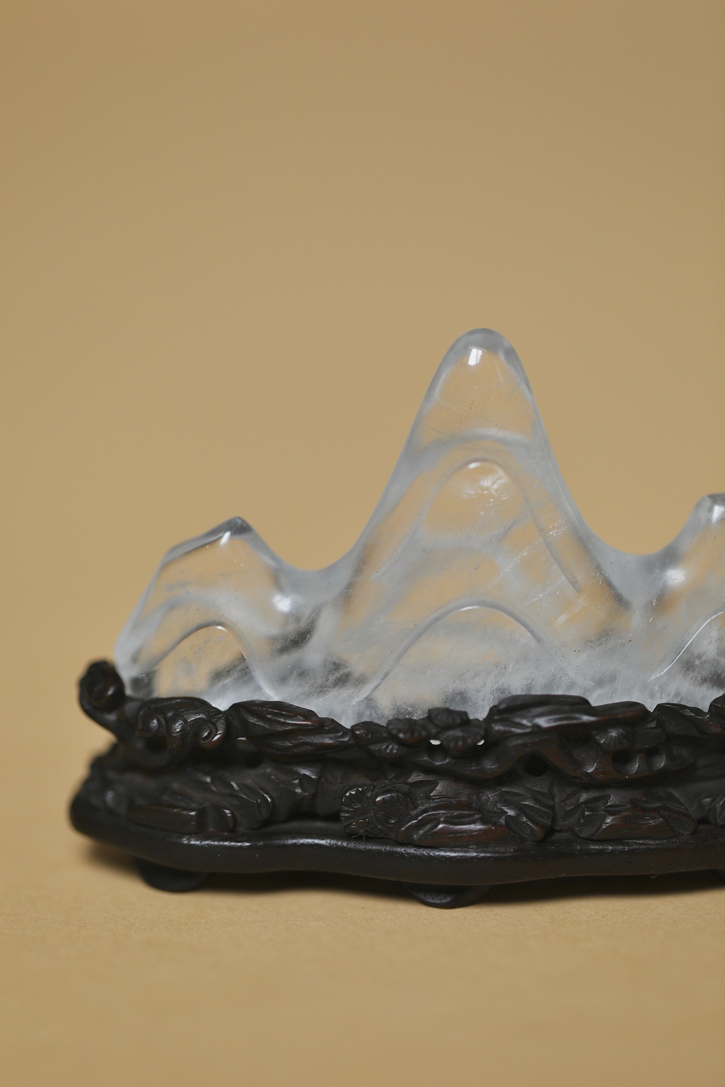 此件笔架以经典三山式为骨,主峰巍峨耸峙,两侧峰峦起伏有致,线条婉转如自然山峦,既合“笔架如山”的传统形制,又藏“远山含黛”的诗意意境。配木底座,雕工细腻,松枝、梅朵、云纹错落有致,包浆温润古雅,与水晶的清透形成刚柔并济的视觉层次,既承托笔山,更添古韵风华。