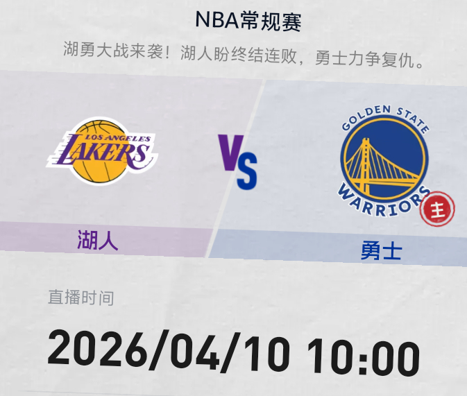 明早10点 金州勇士主场迎客湖人队背靠背首战 铂金休战 勇士能否复仇取连胜勇士:波杰 梅尔顿 斯宾塞 莱昂斯 格林湖人:肯纳德 拉拉维亚 詹姆斯 八村垒 艾顿背靠背首战 愿球员们健康完赛金州勇士湖人vs勇士我的观赛搭子