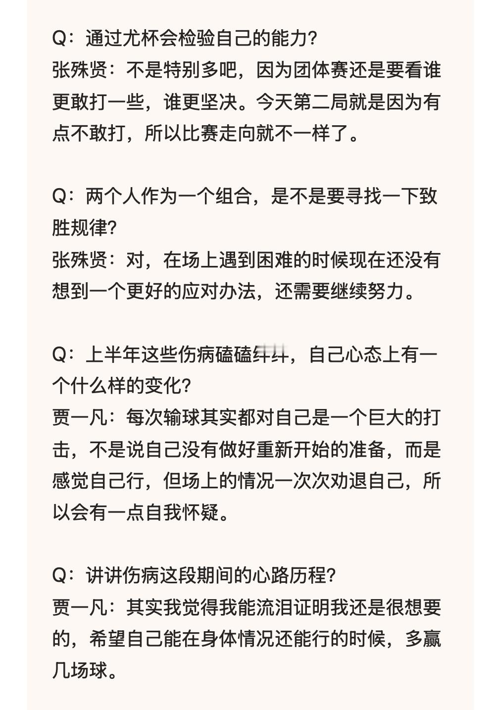 【贾一凡赛后采访:我觉得我能流泪证明我还是很想要赢的】Q:身体状况影响了你们的比