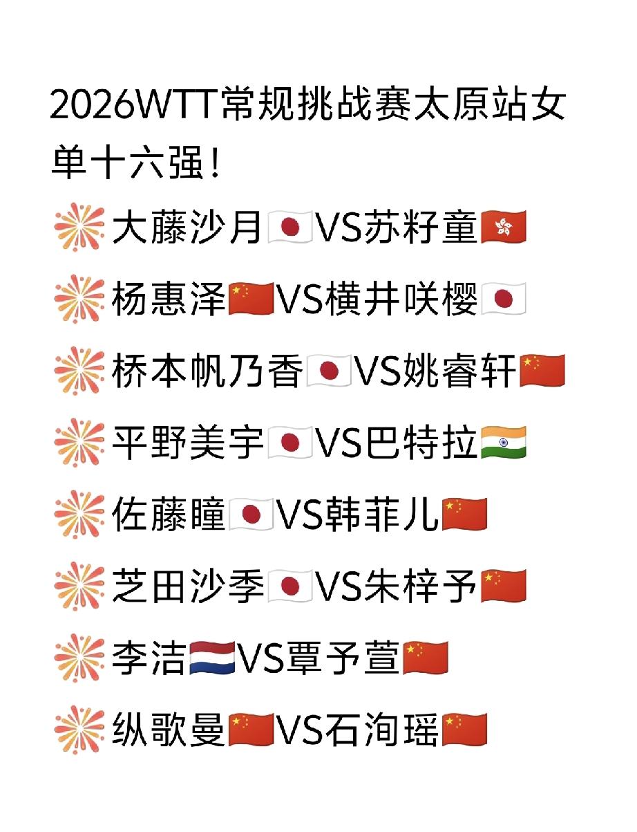 2026WTT常规挑战赛太原站女单十六强新鲜出炉。