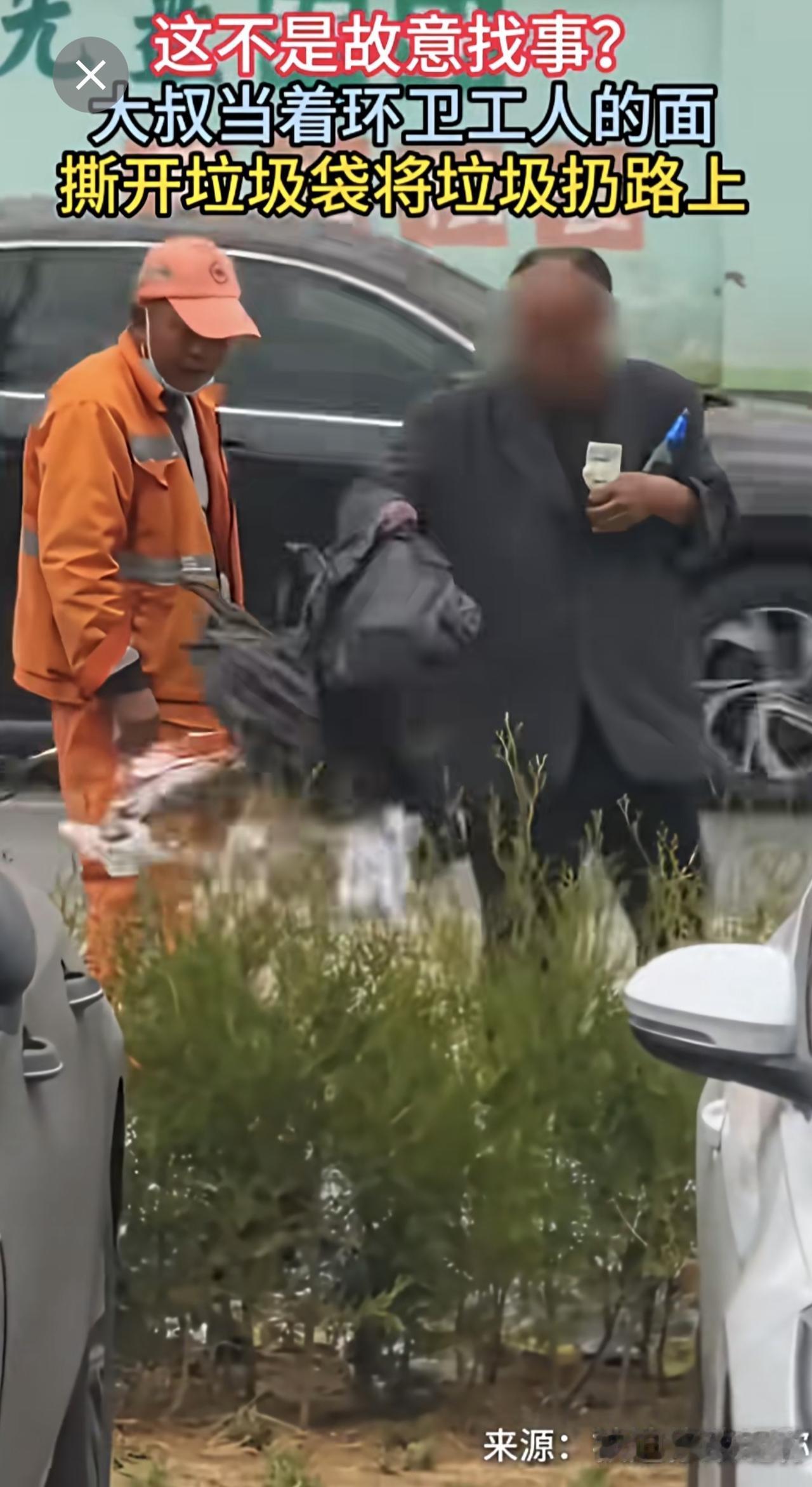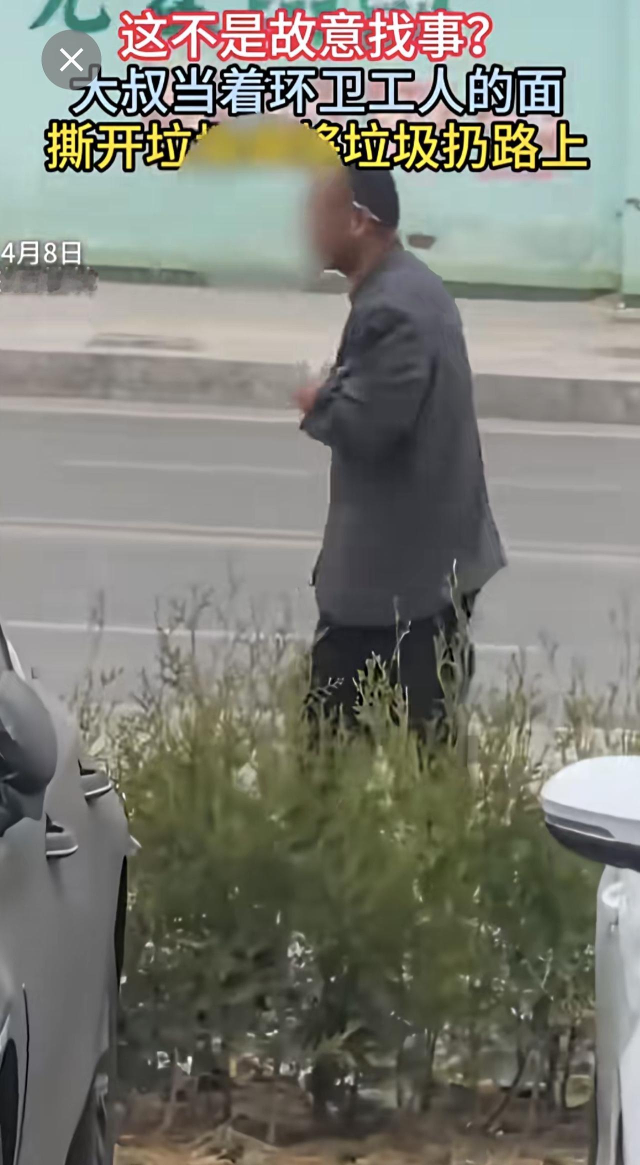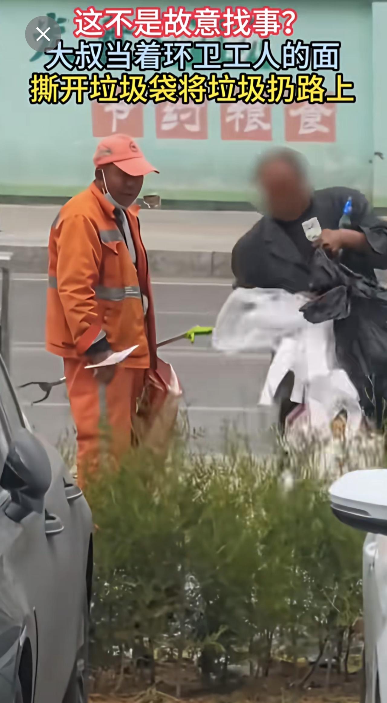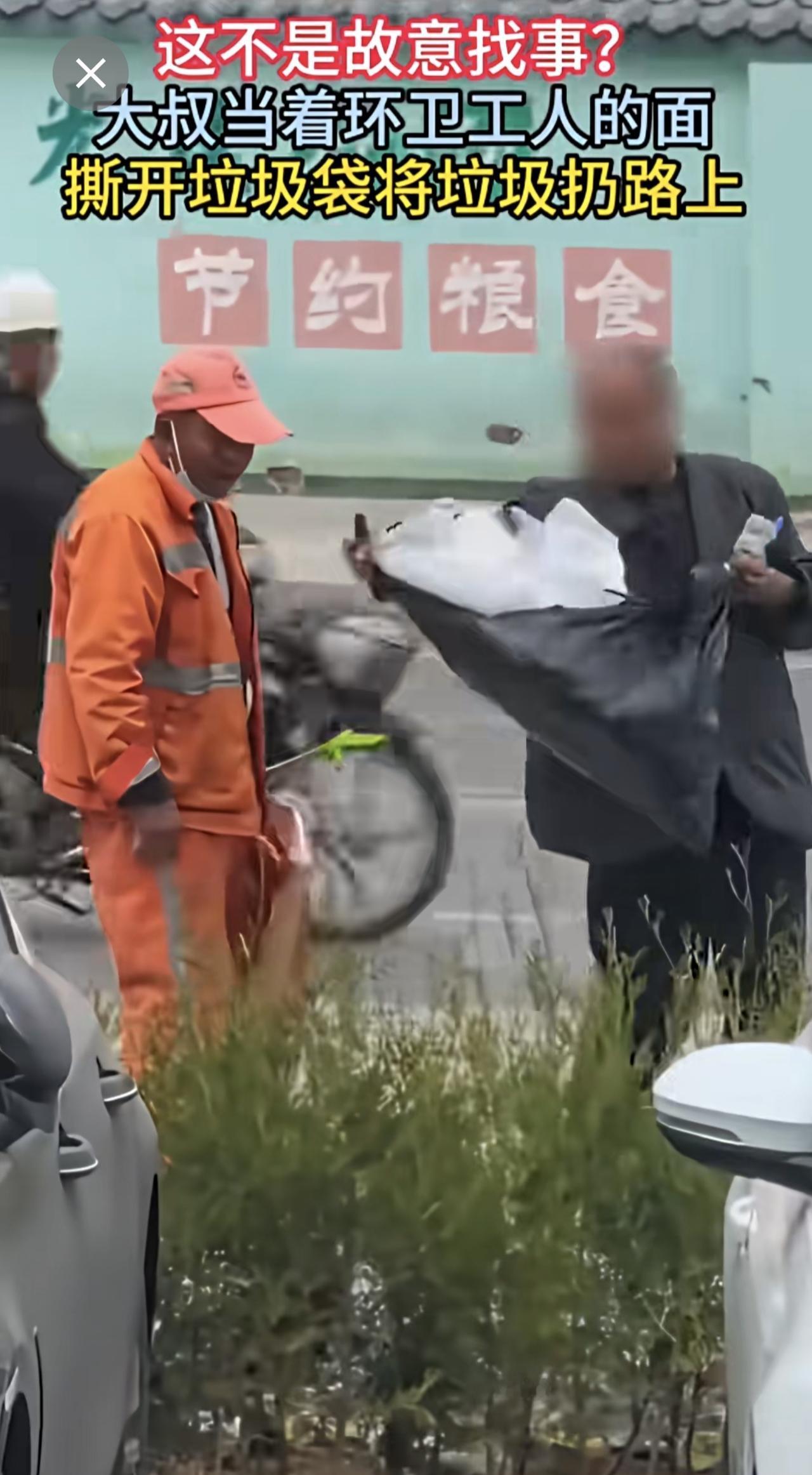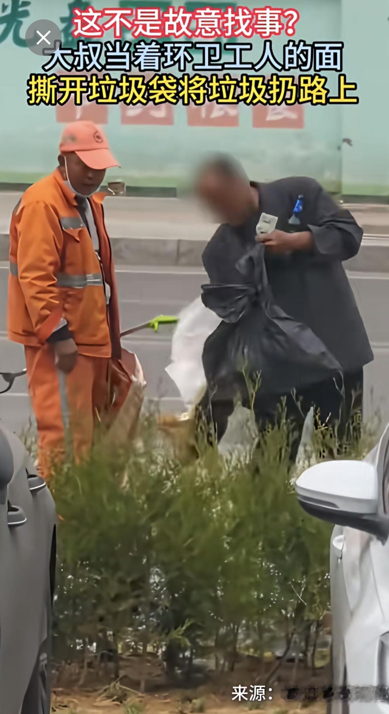 大叔当着环卫工人的面,撕开垃圾袋将垃圾扔路上。(来源:河南法治报)