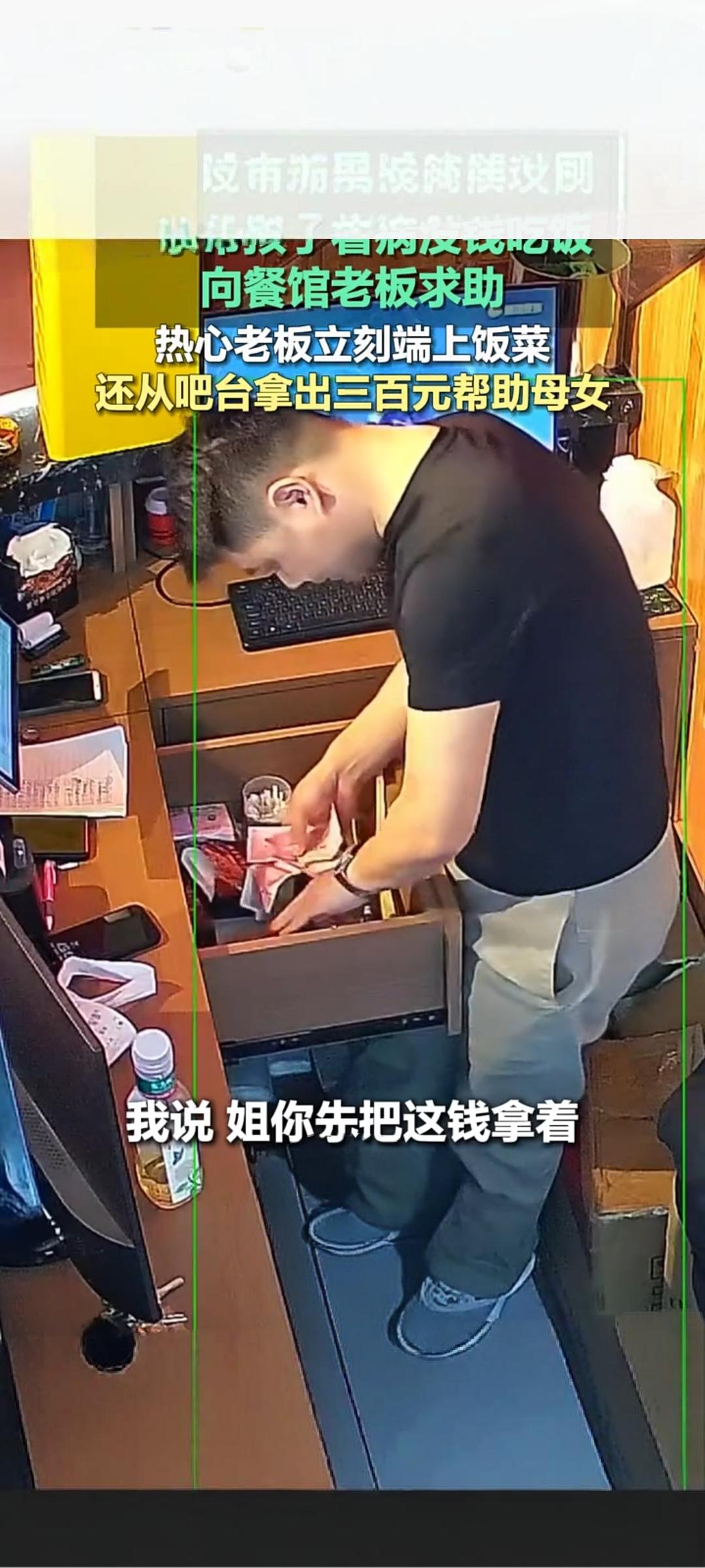 用餐结束后,老板不仅额外打包一份饭菜让母女带走,还从吧台取出三百元现金递给她们,希望能帮她们缓解燃眉之急。面对感谢,老板朴实表示,遇到困难的人能帮就帮,至少在自己店里,能让她们吃上一口热饭 。