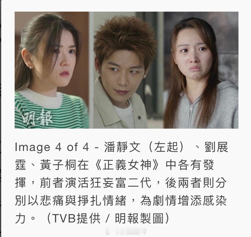 無綫劇《正義女神》昨晚(8日)一集先後審理「秋月樓縱火案」及「兒童之家偽造文書案」,除佘詩曼與譚耀文的對手戲引起關注外,劉展霆、黃子桐及潘靜文3位新生代演員亦憑「縱火案」演出成功突圍。其中「縱火案」講述富二代趙世孝(劉展霆飾)因王偉明(黃耀煌飾)一句「垃圾」及斥責其沒有家教,竟憤而縱火燒屋,導致偉明嚴重燒傷,情况危殆。被起訴的世孝,其父趙坤(煒烈飾)為惡勢力人物,為包庇兒子不惜毀滅證據,甚至禁錮事件唯一證人、世孝表姐林薏冰(潘靜文飾),令她無法出庭作供,致使審訊一再延期。最終,言官(佘詩曼飾)挺身對抗趙坤及一眾惡勢力,令薏冰得以出庭指證世孝。