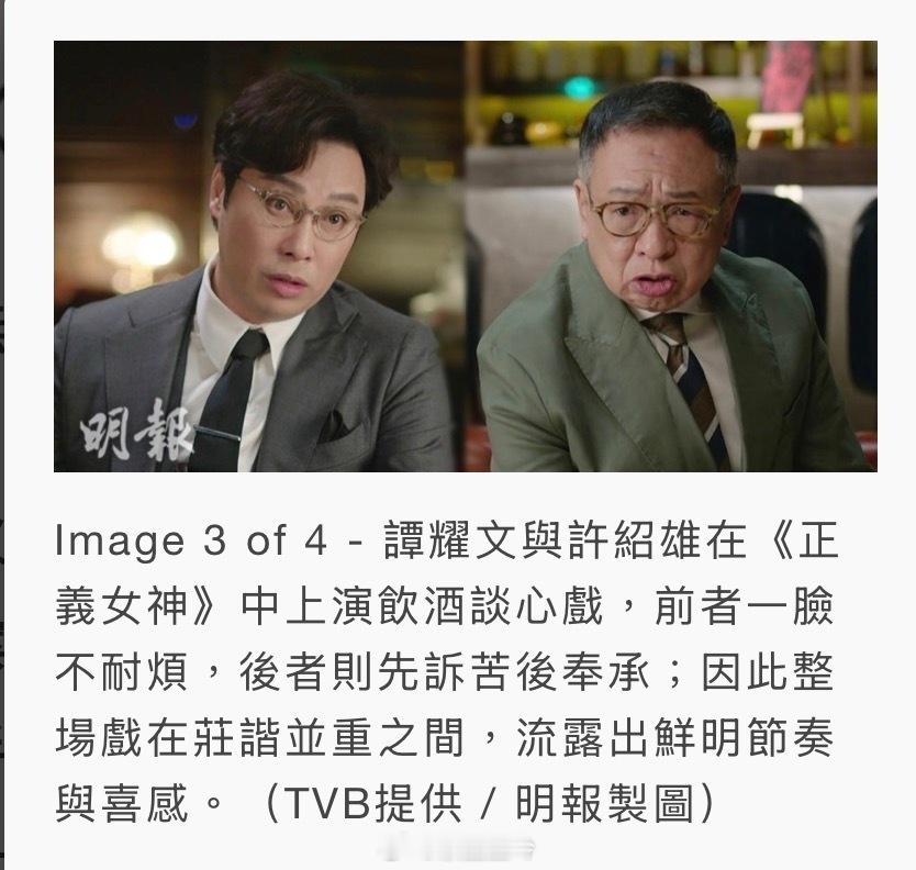 譚耀文的演出同樣搶眼。除了與佘詩曼並肩衝入醫院的一幕盡顯默契外,2人在咖啡室相遇的一場戲,雖然對白不多,但眼神交流充滿戲味。譚耀文與許紹雄的飲酒談心戲亦帶來另一種戲劇效果。劇情講述許紹雄因與兒子知行(丘梓謙飾)鬧翻,又遭妻子(康華飾)嫌棄,遂找光正飲酒訴苦;惟光正全程只顧玩電話,還不時出言反駁對方。譚耀文不耐煩的神情與許紹雄先扁嘴後奉承的反應,令場面既具喜感,亦充滿戲味。