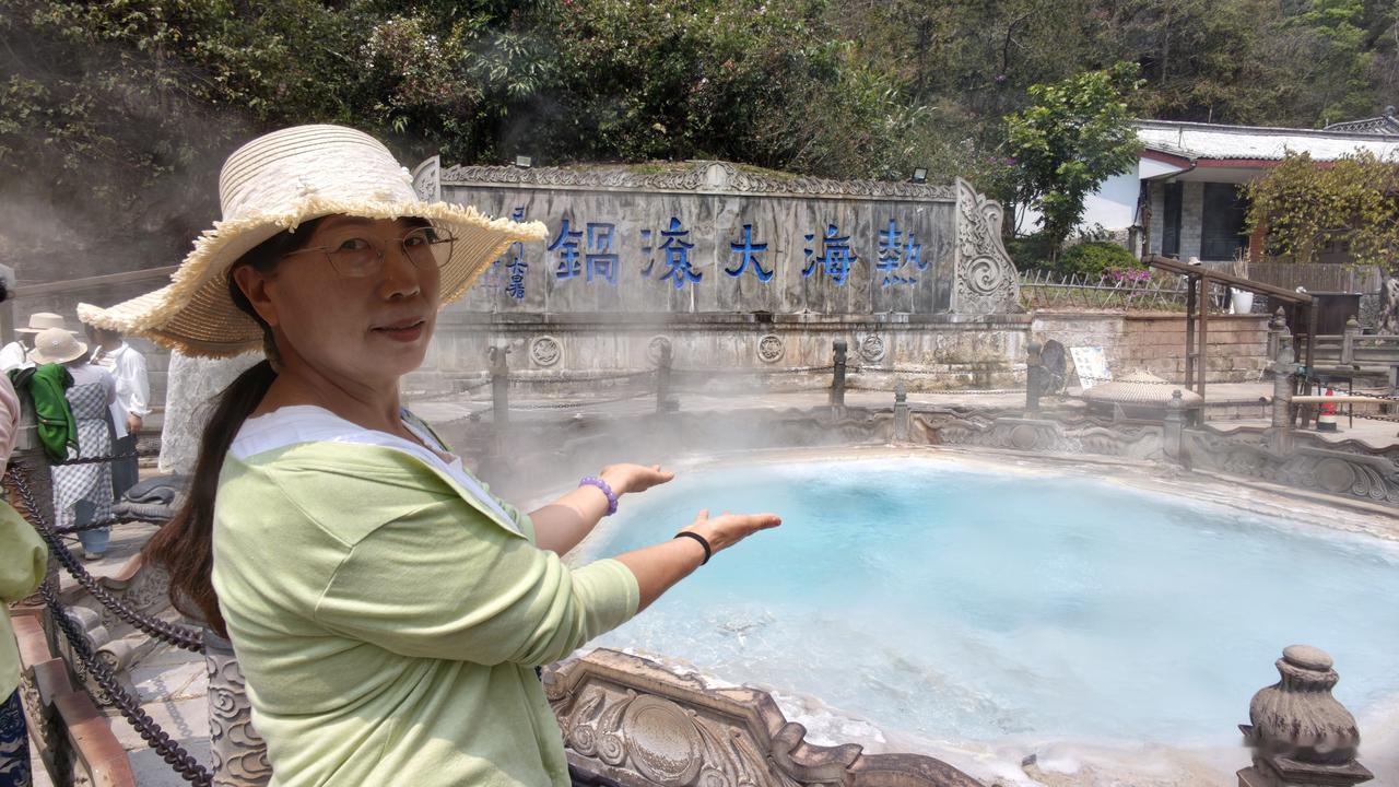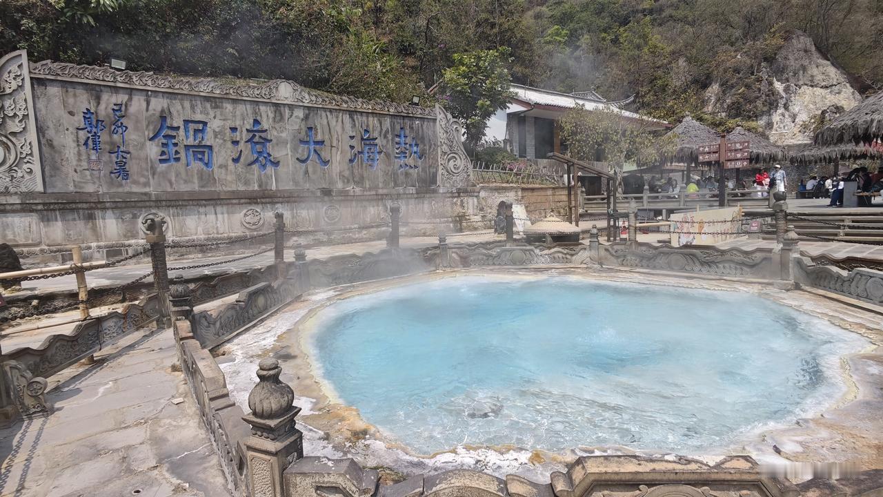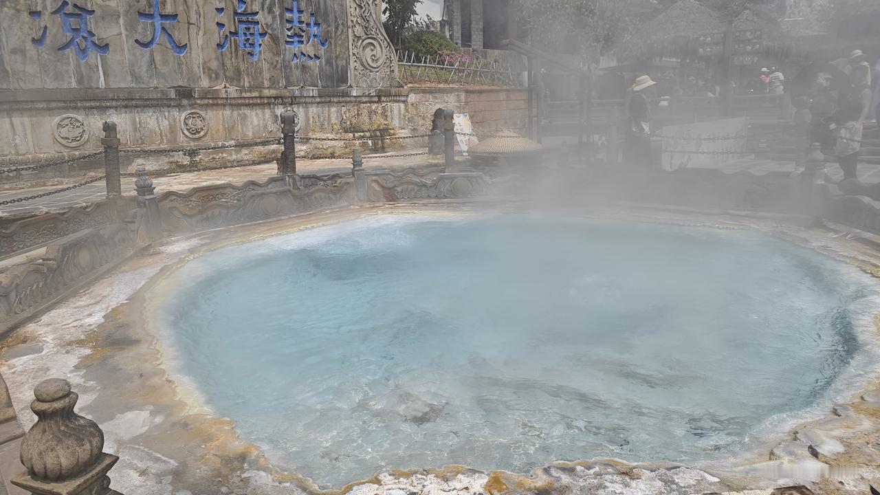 之后拐入到热海景区的小路。又是盘山,从八百多米一直到1500多米。购票进入,还要爬一座小山。倒是有点儿意思,沿途的几个喷气泉,喷水泉第一次见到,味道有点儿臭鸡蛋味。要到日海还要爬很高的坡。游客很多,那水湛蓝湛蓝。