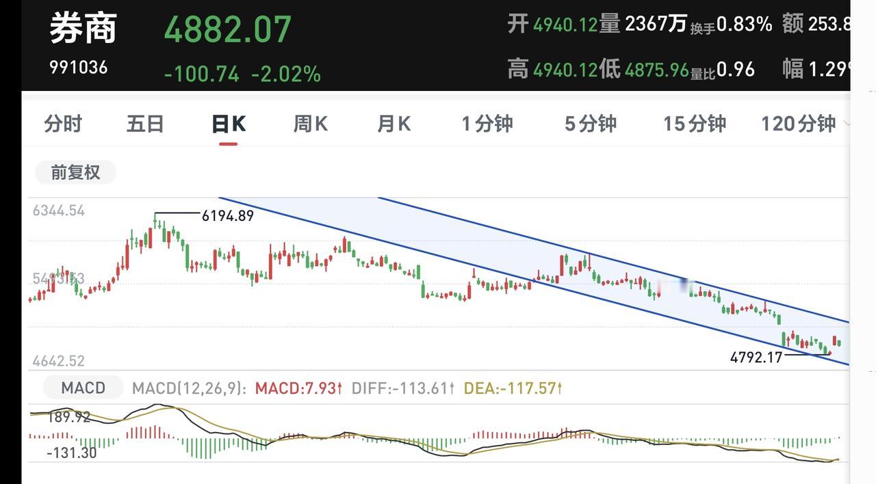 看下面的截图10,这是券商板块日K线图,这个板块日线级别处于短期下跌通道中,距离下跌通道上下轨的空间差不多远,小幅度的上涨都改变不了这个板块日线级别的下跌趋势,短线持有的人继续注意风险,进场的人需要耐心等待,现阶段设置定投就可以了,我是每天定投200块钱。