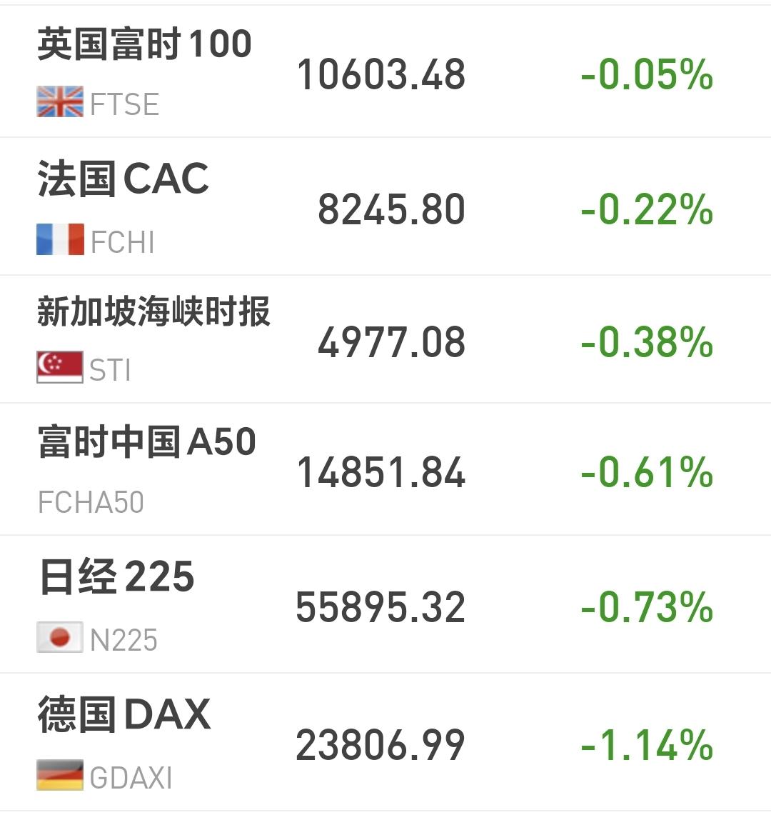 欧洲市场昨天晚上下跌,英国下跌了0.05%,法国下跌了0.22%,德国下跌了1.14%,下跌幅度都不大。